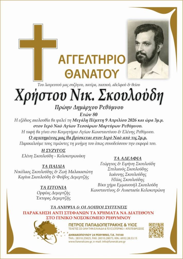 «Με βαθιά θλίψη πληροφορηθήκαμε την απώλεια του πρώην Δημάρχου Ρεθύμνης, Χρήστου Σκουλούδη, ενός ανθρώπου, που υπηρέτησε με αφοσίωση και ήθος τον τόπο μας.