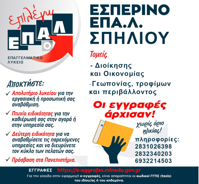 Ο Δήμος Αγίου Βασιλείου ενημερώνει τους δημότες του για την έναρξη εγγραφών στο νεοϊδρυθέν Eσπερινό Επαγγελματικό Λύκειο (ΕΠΑ.Λ.) Σπηλίου, για το σχολικό έτος 2023-2024.