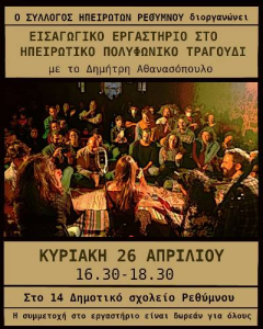 Εισαγωγικό εργαστήριο στο Ηπειρώτικο Πολυφωνικό τραγούδι διοργανώνει ο Σύλλογος Ηπειρωτών Ρεθύμνου την Κυριακή 26 Απριλίου 2026, από τις 16:30 έως τις 18:30 στο 14ο Δημοτικό Σχολείο Ρεθύμνου.
