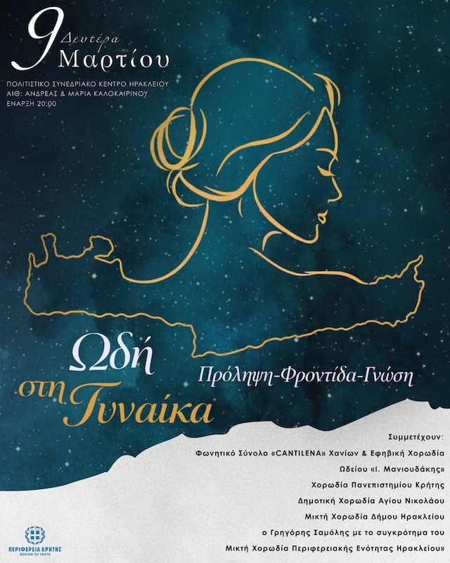 Με αφορμή την Παγκόσμια Ημέρα της Γυναίκας, η Περιφέρεια Κρήτης διοργανώνει τη Δευτέρα 9 Μαρτίου 2026 και ώρα 20:00 εκδήλωση με θέμα: «Πρόληψη – Φροντίδα – Γνώση. Ωδή στη Γυναίκα».