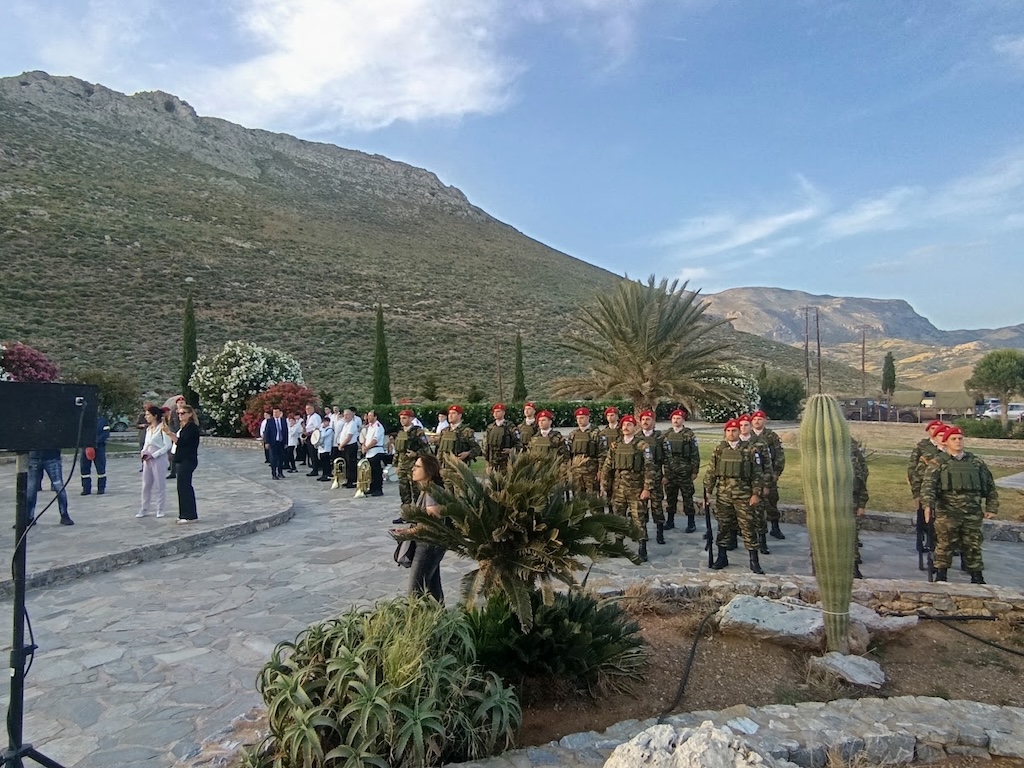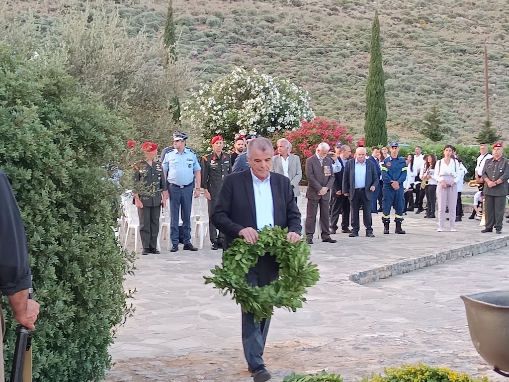 Η τελετή ξεκίνησε με την απόδοση τιμών από τμήμα της 5ης Αερομεταφερόμενης Ταξιαρχίας και τη Φιλαρμονική του Δήμου Ρεθύμνης. Ακολούθησαν επιμνημόσυνη δέηση, χαιρετισμός από εκπρόσωπο του Σεβασμιότατού Μητροπολίτη Λάμπης, Συβρίτου & Σφακίων κ.κ. Ειρηναίου και ομιλία από την Αντιδήμαρχο Πολιτισμού του Δήμου Αγίου Βασιλείου κα Ευαγγελία Γλαμπεδάκη, με θέμα «Η συμβολή της επαρχίας Αγίου Βασιλείου στην περίοδο της Κατοχής».