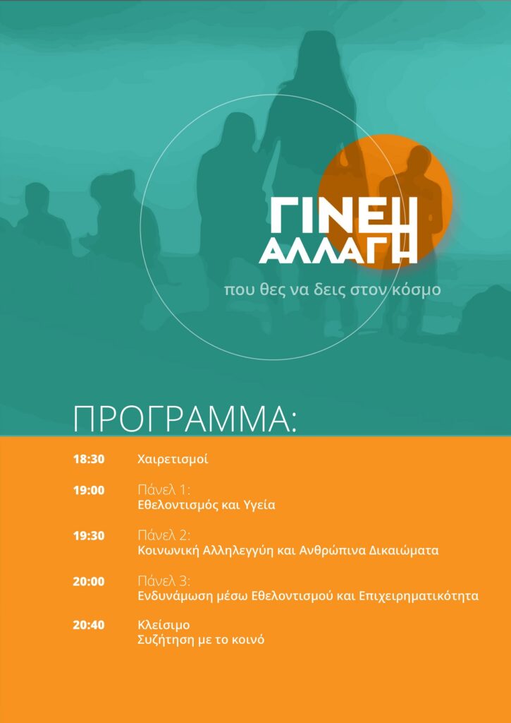 «Έλα να εμπνευστείς και να γίνεις μέρος της αλλαγής!», είναι το σύνθημα της εκδήλωσης που στοχεύει ν’ αναδείξει τον ρόλο του εθελοντισμού ως μοχλό προσωπικής ανάπτυξης, κοινωνικής συμμετοχής και συλλογικής προσφοράς. Μέσα από ένα δημιουργικό και διαδραστικό πρόγραμμα, νέοι και νέες θα έχουν την ευκαιρία να γνωρίσουν οργανώσεις, να ανταλλάξουν εμπειρίες και να ανακαλύψουν πώς μπορούν να συμβάλουν ενεργά στη διαμόρφωση μιας πιο ανθρώπινης και δίκαιης κοινωνίας.