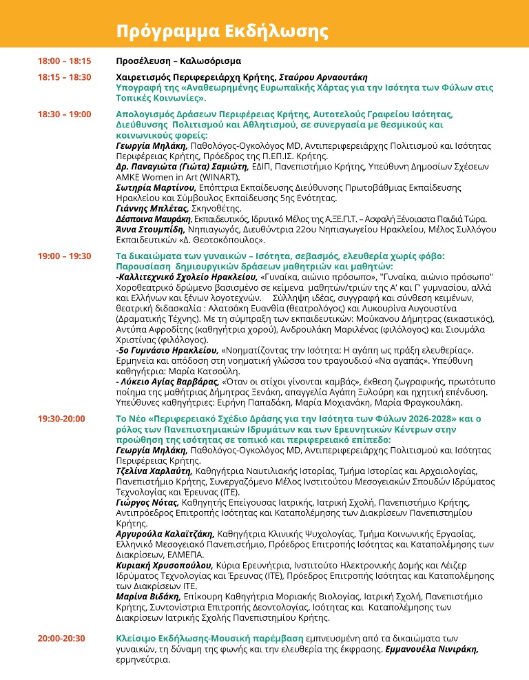 Όπως δήλωσε η Αντιπεριφερειάρχης Πολιτισμού και Ισότητας της Περιφέρειας Κρήτης και Πρόεδρος της Π.ΕΠ.ΙΣ. Κρήτης, Γεωργία Μηλάκη: «Η εκδήλωση αποτελεί μια ανοιχτή πρόσκληση διαλόγου και δράσης για την ισότητα, τα δικαιώματα και την ενδυνάμωση των γυναικών και των κοριτσιών, αναδεικνύοντας τη σημασία της ισότιμης συμμετοχής τους σε κάθε τομέα της κοινωνικής, πολιτικής και πολιτιστικής ζωής. Η υπογραφή της Αναθεωρημένης Ευρωπαϊκής Χάρτας για την Ισότητα των Φύλων στις Τοπικές Κοινωνίες αποτελεί μια ουσιαστική πολιτική δέσμευση και στρατηγική προτεραιότητα. Με το νέο Περιφερειακό Σχέδιο Δράσης για την Ισότητα των Φύλων 2026-2028, μετατρέπουμε αυτή τη δέσμευση σε συγκεκριμένες, μετρήσιμες παρεμβάσεις που διαπερνούν όλους τους τομείς της πολιτικής της Περιφέρειας. Στόχος μας είναι η έμφυλη ισότητα να ενσωματώνεται οριζόντια στον σχεδιασμό, στη λήψη αποφάσεων και στην καθημερινή λειτουργία των υπηρεσιών μας. Η σύνδεση της Περιφέρειας με την κοινωνία των πολιτών και την ακαδημαϊκή και ερευνητική κοινότητα δημιουργεί ένα ισχυρό πλαίσιο συνέργειας, όπου η επιστημονική τεκμηρίωση, η καινοτομία και ο στρατηγικός σχεδιασμός ενισχύουν την αποτελεσματικότητα των δημόσιων πολιτικών. Μέσα από αυτή τη συνεργασία, η ισότητα των φύλων αναδεικνύεται σε οριζόντια προτεραιότητα περιφερειακής ανάπτυξης και κοινωνικής συνοχής».
