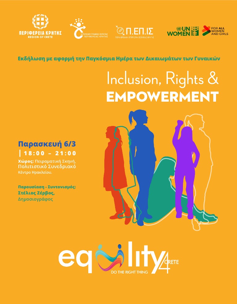 Η Περιφέρεια Κρήτης, Αυτοτελές Γραφείο Ισότητας Περιφέρειας Κρήτης και Περιφερειακή Επιτροπή Ισότητας των Φύλων (Π.ΕΠ.ΙΣ.) Κρήτης διοργανώνουν εκδήλωση ενημέρωσης και ευαισθητοποίησης, με αφορμή την «Παγκόσμια Ημέρα των Δικαιωμάτων των Γυναικών», η οποία εορτάζεται κάθε χρόνο στις 8 Μαρτίου σε όλο τον κόσμο, με σκοπό την ανάδειξη των αγώνων των γυναικών για δικαιοσύνη, ελευθερία και αξιοπρέπεια, αλλά και ως υπενθύμιση ότι η έμφυλη ισότητα παραμένει ζητούμενο και συλλογική ευθύνη των σύγχρονων κοινωνιών.