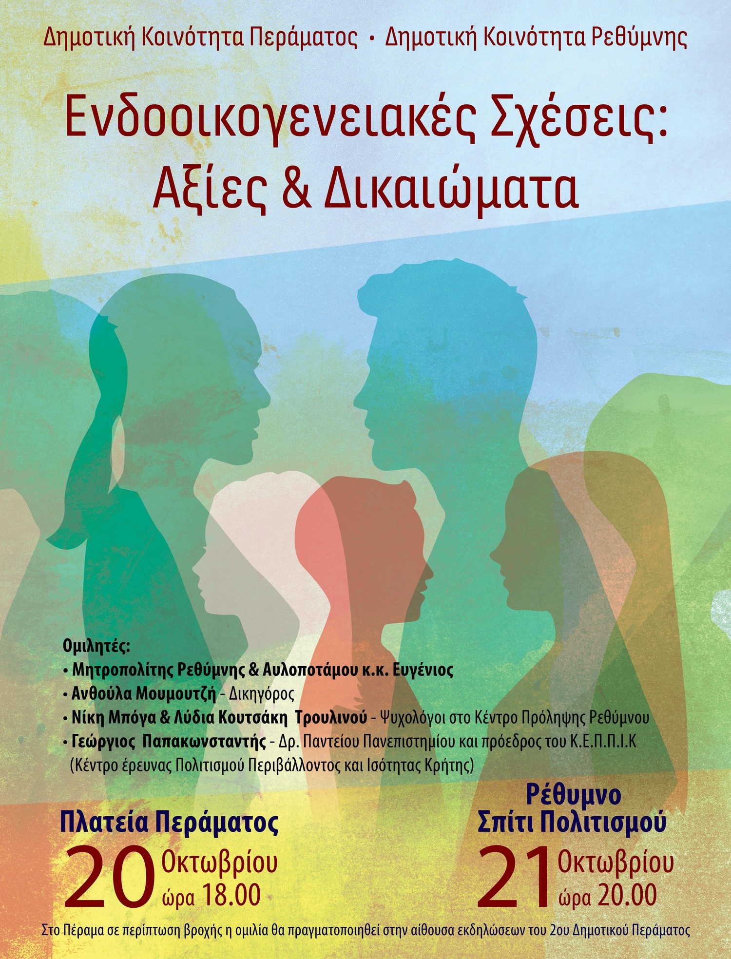 Η Δημοτική Κοινότητα Ρεθύμνης & Δημοτική Κοινότητα Περάματος σας προσκαλούν να τιμήσετε με την παρουσία σας την εκδήλωση με θέμα: Ενδοοικογενειακές Σχέσεις: Αξίες & Δικαιώματα.