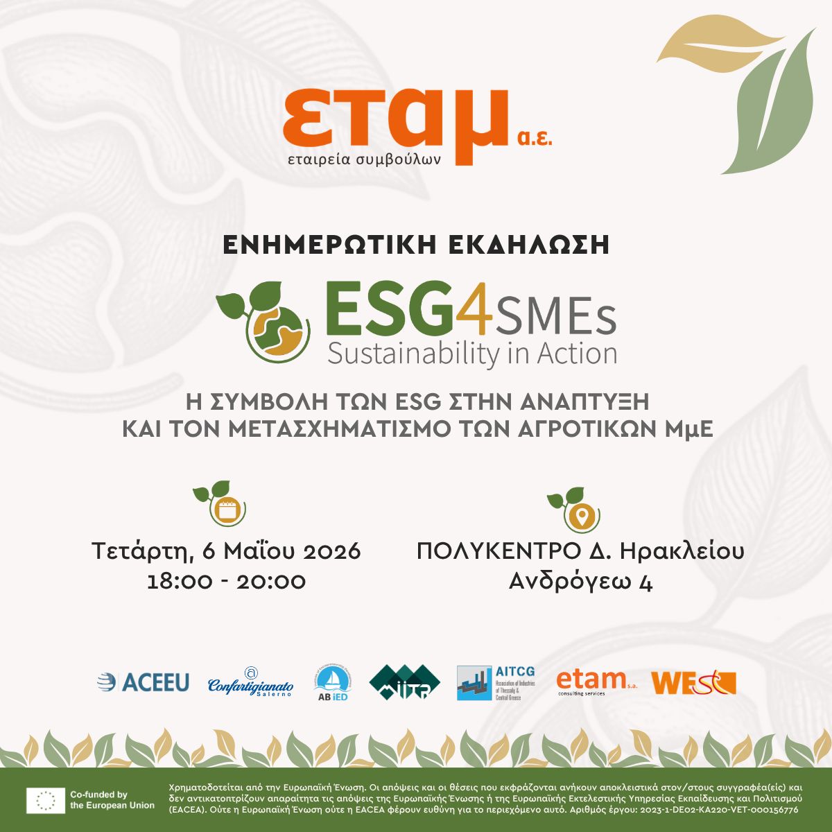 Η ΕΤΑΜ Α.Ε., εταίρος του έργου ESG4SMEs, διοργανώνει ενημερωτική εκδήλωση με θέμα «Η συμβολή των ESG στην ανάπτυξη και τον μετασχηματισμό των αγροτικών μικρομεσαίων επιχειρήσεων», η οποία θα πραγματοποιηθεί την Τετάρτη 6 Μαΐου 2026, από τις 18:00 έως τις 20:00, στο ΠΟΛΥΚΕΝΤΡΟ Δήμου Ηρακλείου, Ανδρόγεω 4.