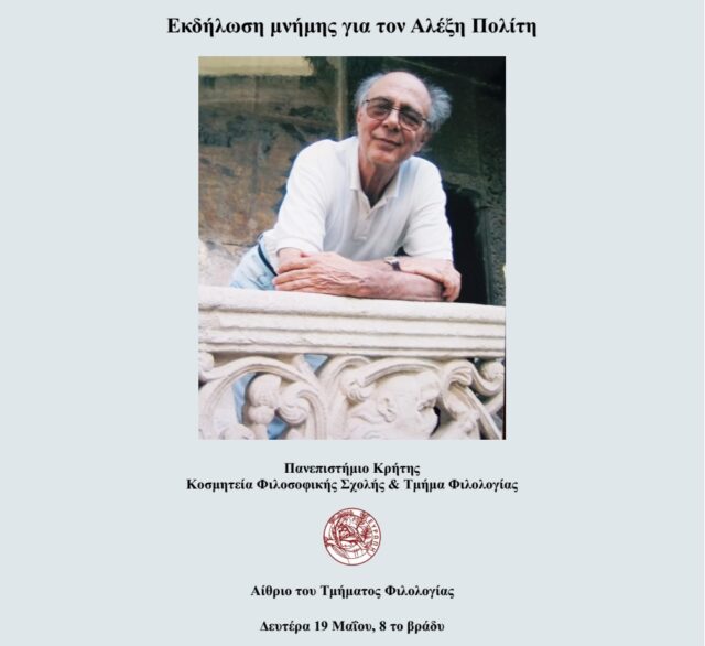 Τη Δευτέρα 19 Μαΐου 2025, στις 8 το βράδυ, θα πραγματοποιηθεί εκδήλωση μνήμης για τον Αλέξη Πολίτη, που άφησε την τελευταία του πνοή στο Ρέθυμνο τον περασμένο Απρίλιο.