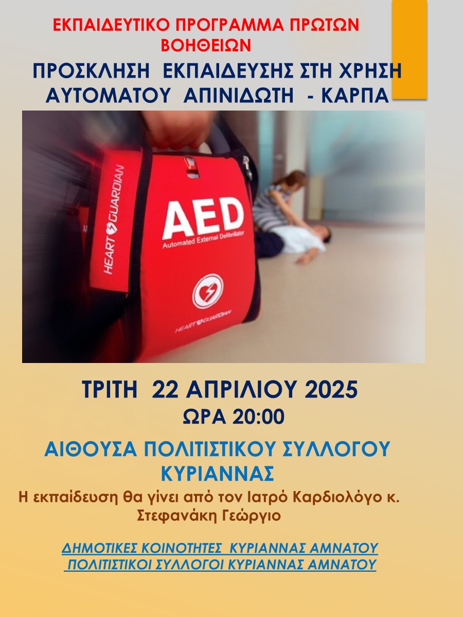 Οι Δημοτικές Κοινότητες και οι Πολιτιστικοί Σύλλογοι Κυριάννας και Αμνάτου Δήμου Ρεθύμνου μας προσκαλούν την Τρίτη 22 Απριλίου 2025 και ώρα 20.00, στην αίθουσα του Πολιτιστικού Συλλόγου Κυριάννας, σε εκπαίδευση στη χρήση του αυτόματου εξωτερικού απινιδωτή.