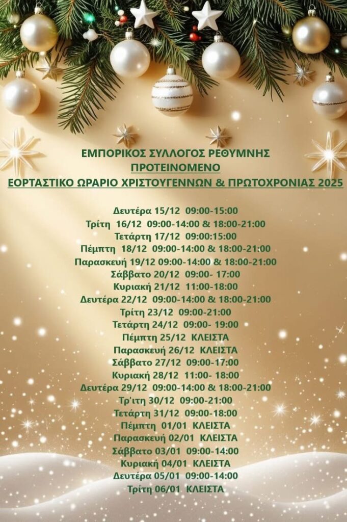 Το προτεινόμενο ωράριο λειτουργίας των εμπορικών καταστημάτων στο Ρέθυμνο, κατά την περίοδο των εορτών:
