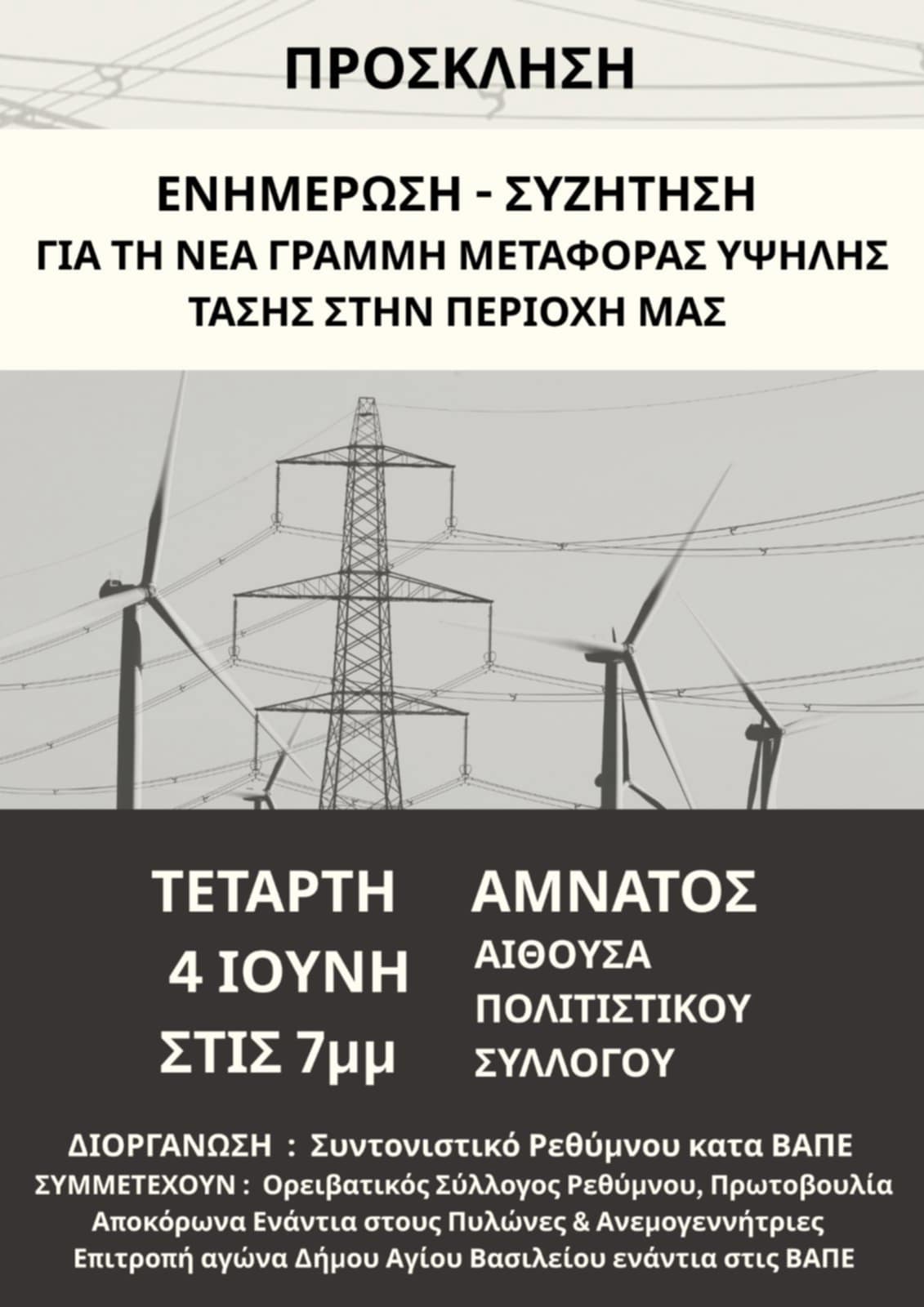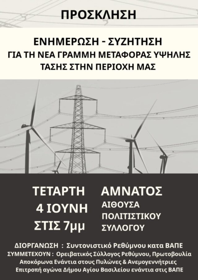 Ενημερωτική συζήτηση για τη σχεδιαζόμενη νέα γραμμή μεταφοράς υψηλής τάσης στην περιοχή θα πραγματοποιηθεί την Τετάρτη 4 Ιουνίου στις 7:00 μ.μ., στην αίθουσα του Πολιτιστικού Συλλόγου Αμνάτου.