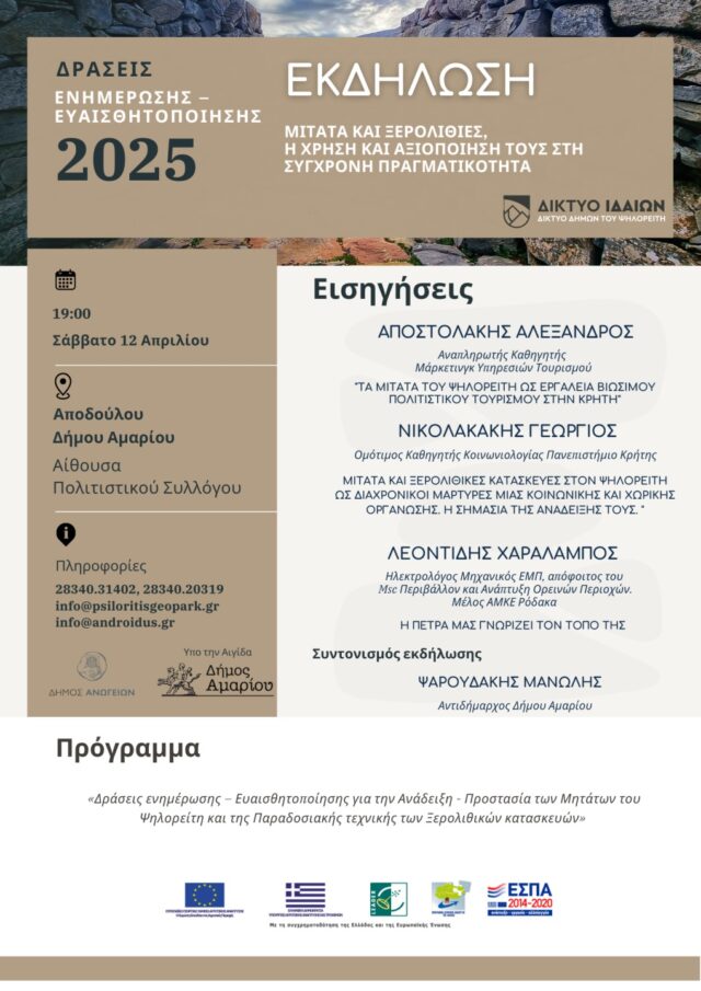 Η εκδήλωση έχει τίτλο «Μιτάτα και Ξερολιθιές, η χρήση και αξιοποίησης τους στη σύγχρονη πραγματικότητα».