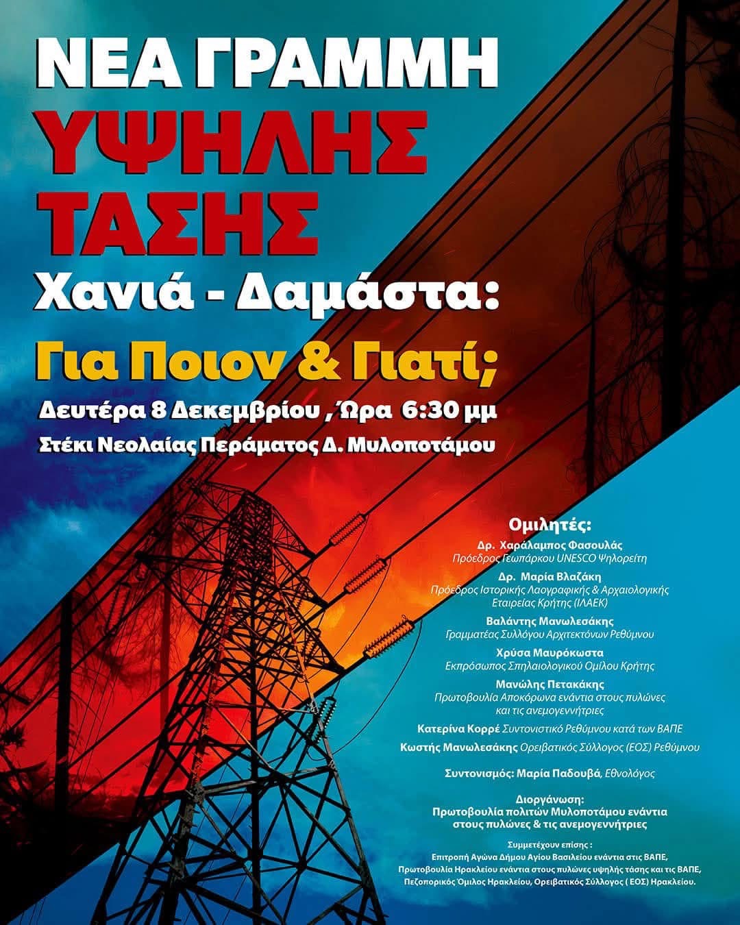 Τη Δευτέρα 8 Δεκεμβρίου 2025 & ώρα 6:30 μ.μ., η Πρωτοβουλία Πολιτών Δήμου Μυλοποτάμου διοργανώνει στο Στέκι Νεολαίας Περάματος Δήμου Μυλοποτάμου ενημερωτική συνάντηση και συζήτηση για τις σοβαρές επιπτώσεις της προγραμματιζόμενης Γραμμής Μεταφοράς Υψηλής Τάσης, στην ορεινή γραμμή από τα Χανιά έως τη Δαμάστα, με πολυάριθμους πυλώνες ύψους 33 μέτρων ο καθένας, με απόσταση από 300-350 μ. μεταξύ τους.