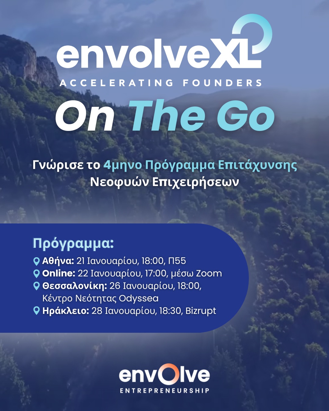 Σε συνεργασία με φορείς και πρωτοβουλίες του δικτύου του, έρχεται το “Envolve On The Go”, ένα ταξίδι για την εξερεύνηση, ανάδειξη και διασύνδεση της startup κοινότητας σε κομβικές πόλεις της Ελλάδας. Οι συναντήσεις αυτές φιλοξενούν startups, επιχειρηματίες, επενδυτές και οργανισμούς στήριξης της καινοτομίας. Στο πλαίσιο των συναντήσεων αυτών, οι ενδιαφερόμενοι μπορούν – μεταξύ άλλων – να ενημερωθούν για το πρόγραμμα επιχειρηματικής επιτάχυνσης EnvolveXL (https://envolveglobal.org/envolvexl) που στηρίζει 20 startups ετησίως, μέσα από επιχειρηματική καθοδήγηση, διεθνή δικτύωση, καθώς και πρόσβαση σε επενδυτικές ευκαιρίες έως 265.000€.