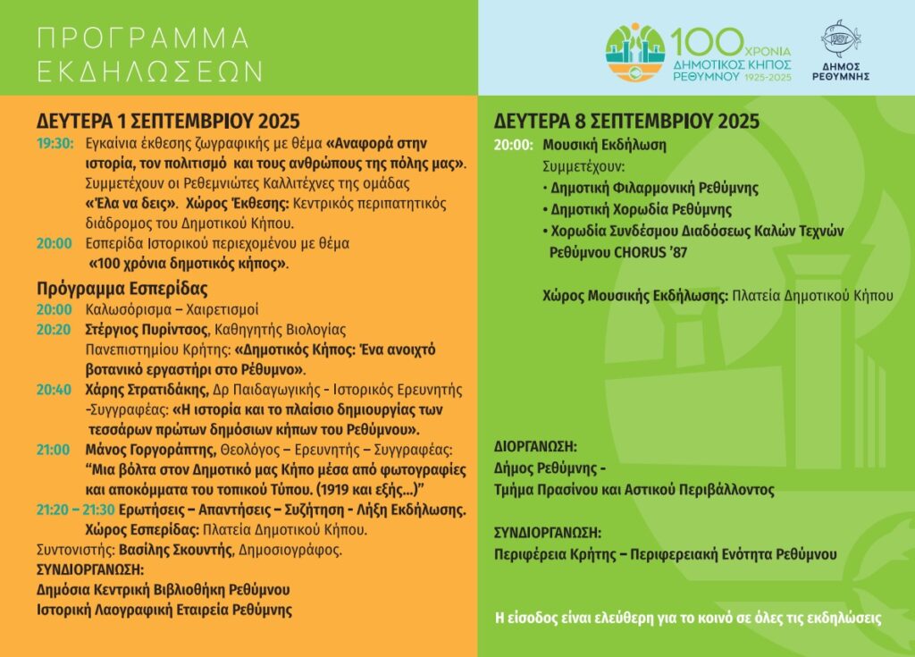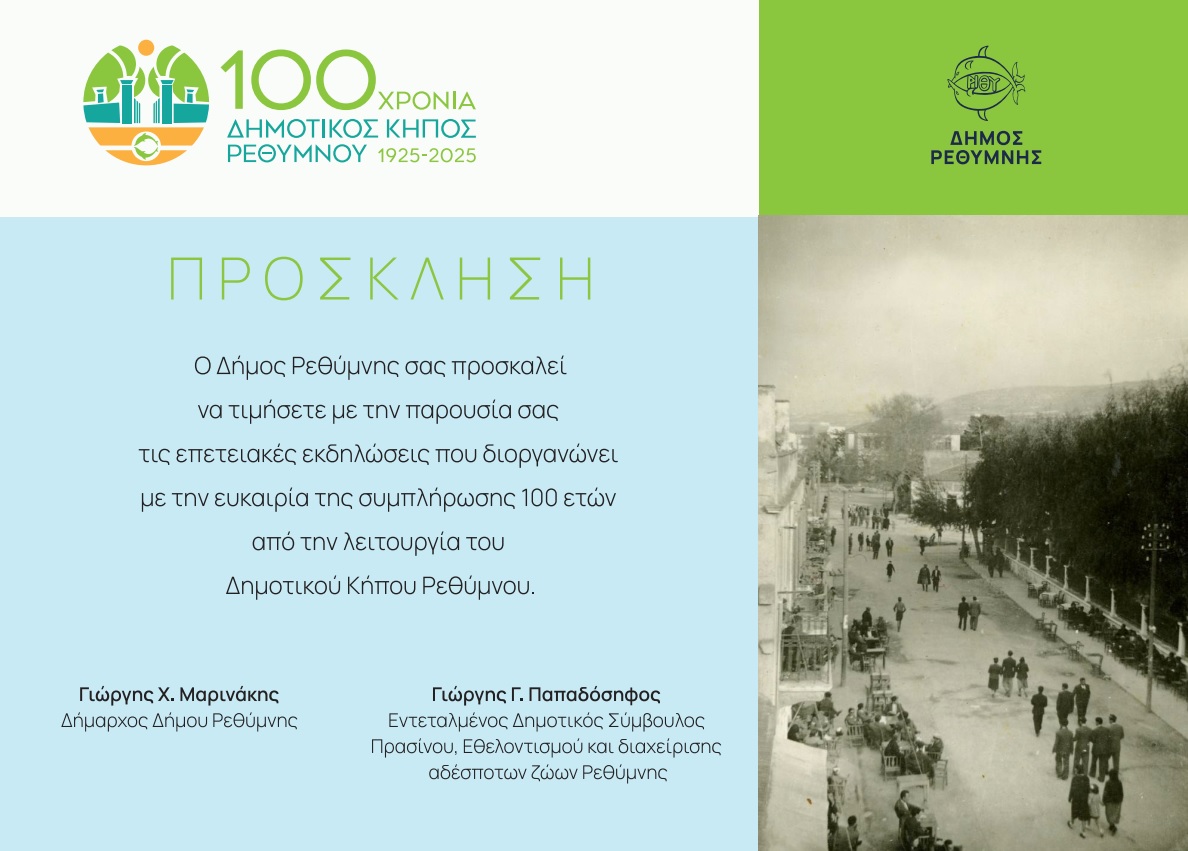 Ο Δήμος Ρεθύμνης σας προσκαλεί στις επετειακές εκδηλώσεις που διοργανώνει με την ευκαιρία της συμπλήρωσης 100 ετών από τη λειτουργία του Δημοτικού Κήπου Ρεθύμνου τη Δευτέρα 1 και τη Δευτέρα 8 Σεπτεμβρίου 2025.
