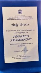 Με ιδιαίτερη τιμή και χαρά, το Γυμνάσιο Ατσιποπούλου υποδέχτηκε την Τρίτη 24 Ιουνίου 2025, τον Προϊστάμενο της Διεύθυνσης Δευτεροβάθμιας Εκπαίδευσης Ρεθύμνου, κύριο Μανούσο Μαραγκάκη, ο οποίος επισκέφθηκε το σχολείο με σκοπό την απονομή τιμητικής πλακέτας.