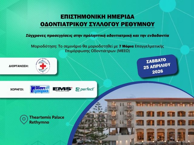 Ο Οδοντιατρικός Σύλλογος Ρεθύμνου διοργανώνει μια επιστημονική ημερίδα με θέμα: «Σύγχρονες προσεγγίσεις στην πρόληπτική οδοντιατρική και την ενδοδοντία» το Σάββατο 25 Απριλίου 2026 στο Theartemis Palace στο Ρέθυμνο.