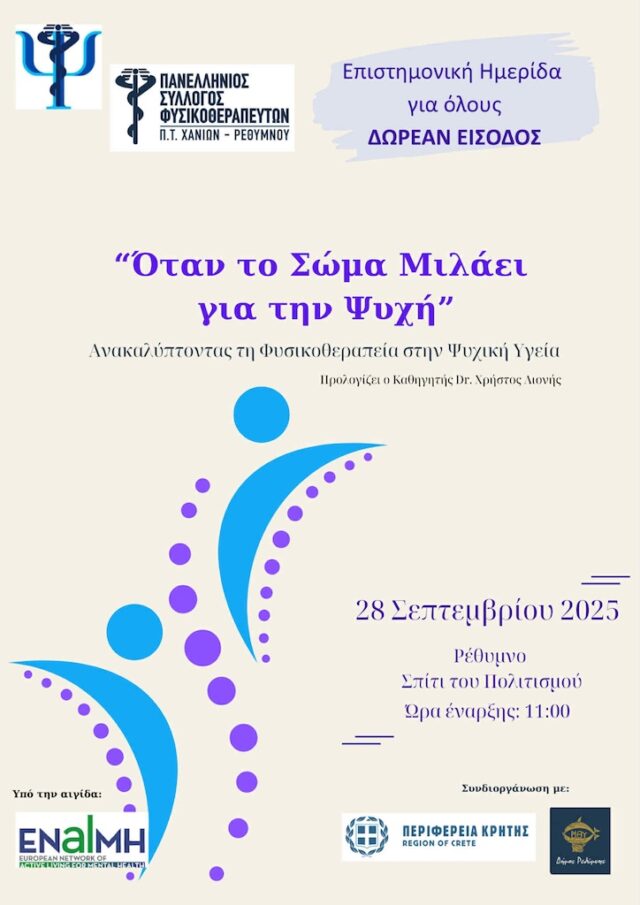 Με την αφορμή αυτή, το Περιφερειακό Τμήμα Χανίων – Ρεθύμνου του Πανελληνίου Συλλόγου Φυσικοθεραπευτών-ΝΠΔΔ μαζί με το Επιστημονικό τμήμα «Φυσικοθεραπεία στην Ψυχική Υγεία» είναι στην ευχάριστη θέση να καλέσουν σε επιστημονική ημερίδα ελεύθερη για το κοινό στις 28 Σεπτεμβρίου στο Ρέθυμνο που θα πραγματοποιηθεί στο Σπίτι του Πολιτισμού.