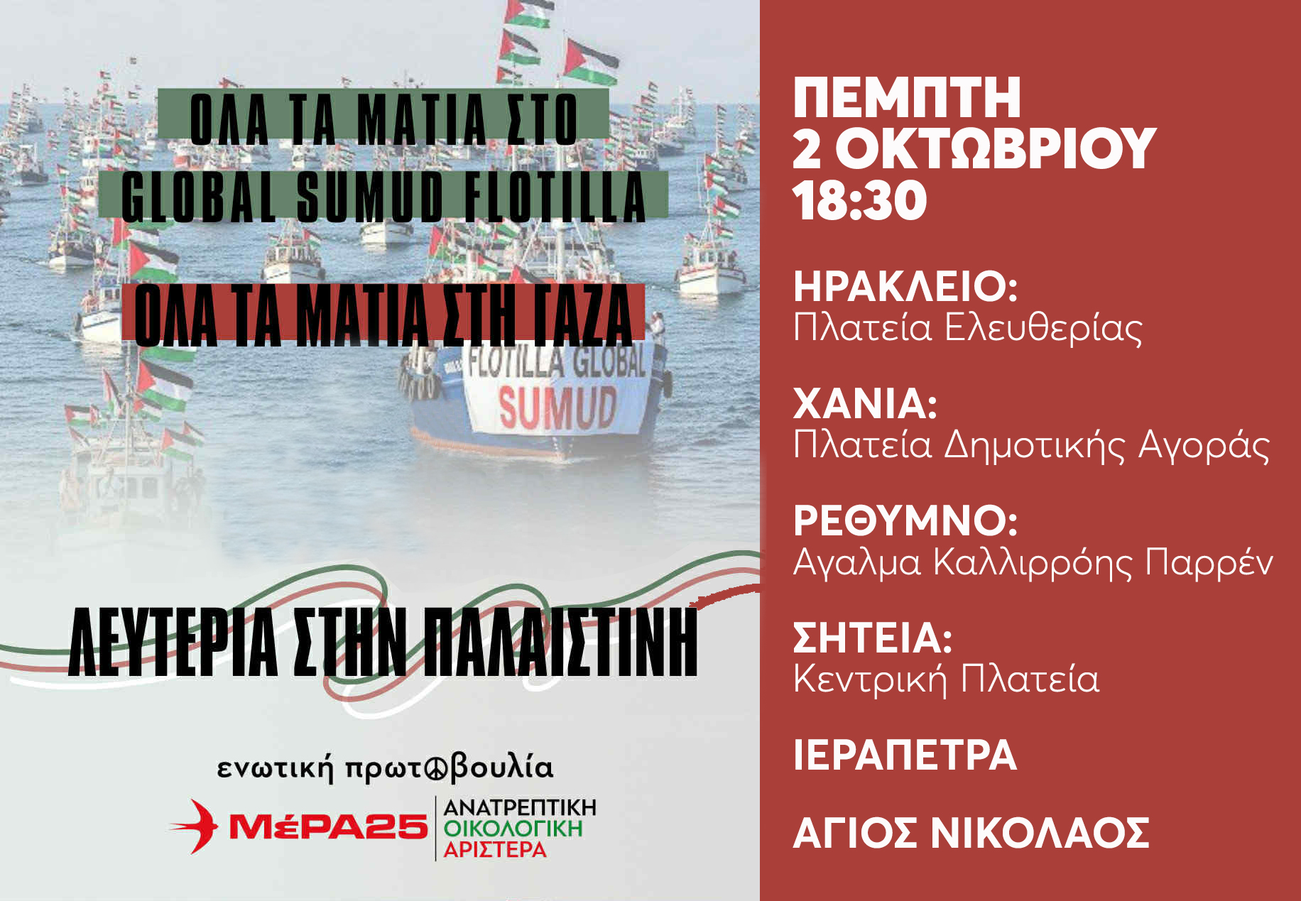 Η Κρήτη στέκεται στο πλευρό του Στόλου, στο πλευρό του παλαιστινιακού λαού που παλεύει για την λευτεριά του. Καταγγέλλουμε την επίθεση του Ισραήλ στο Global Sumud Flotilla και την απαγωγή των πληρωμάτων. Ζητάμε την άμεση παρέμβαση της ελληνικής κυβέρνησης για την προστασία των πληρωμάτων και για την απελευθέρωση όλων των συλληφθέντων.