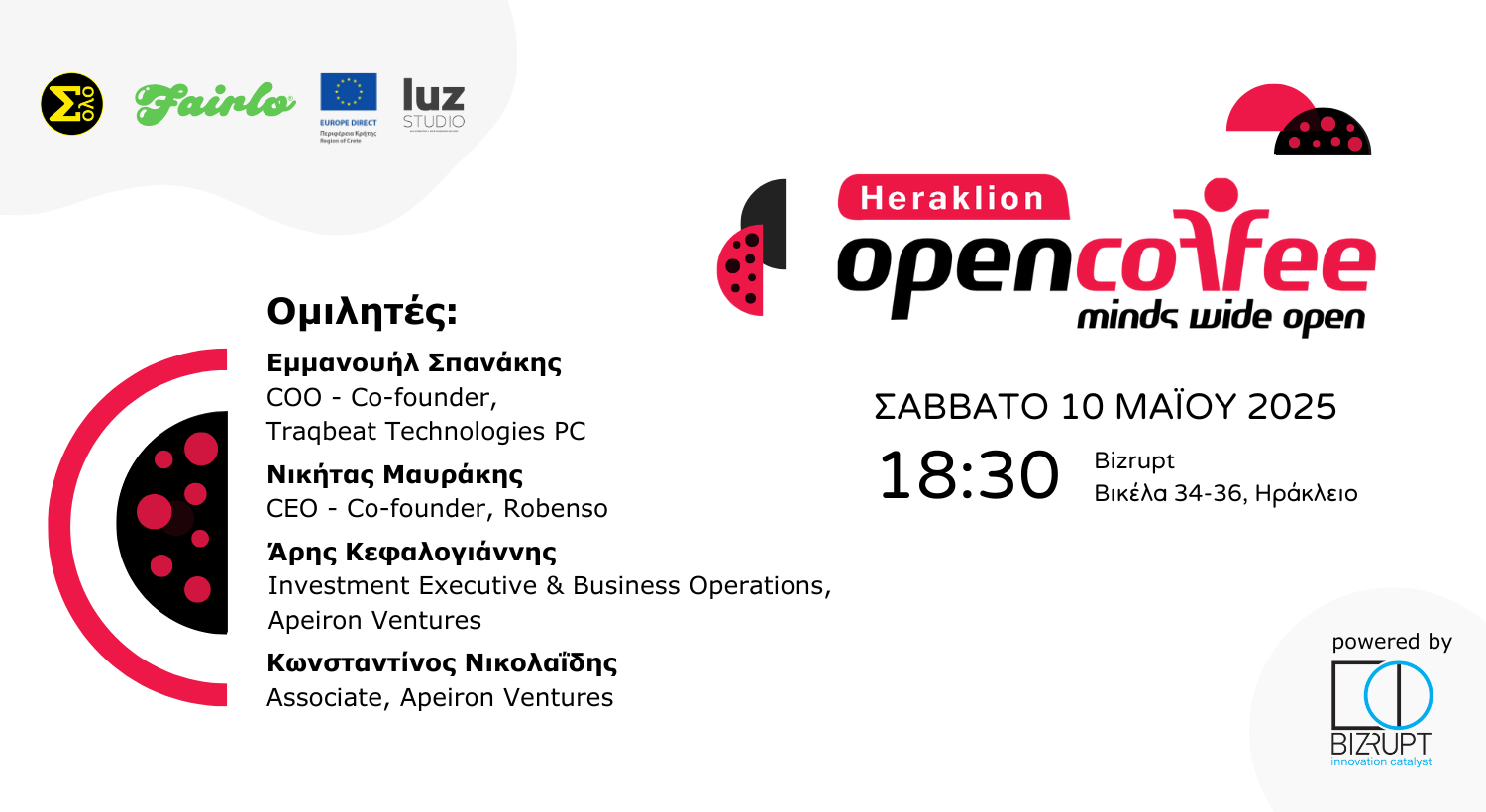 Το 28ο Open Coffee Heraklion έρχεται το Σάββατο, 10 Μαΐου, στις 18:30, στο Bizrupt (Βικέλα 34-36, Ηράκλειο). Σε αυτό το Open Coffee Heraklion meetup, θα έχουμε τη χαρά να φιλοξενήσουμε: