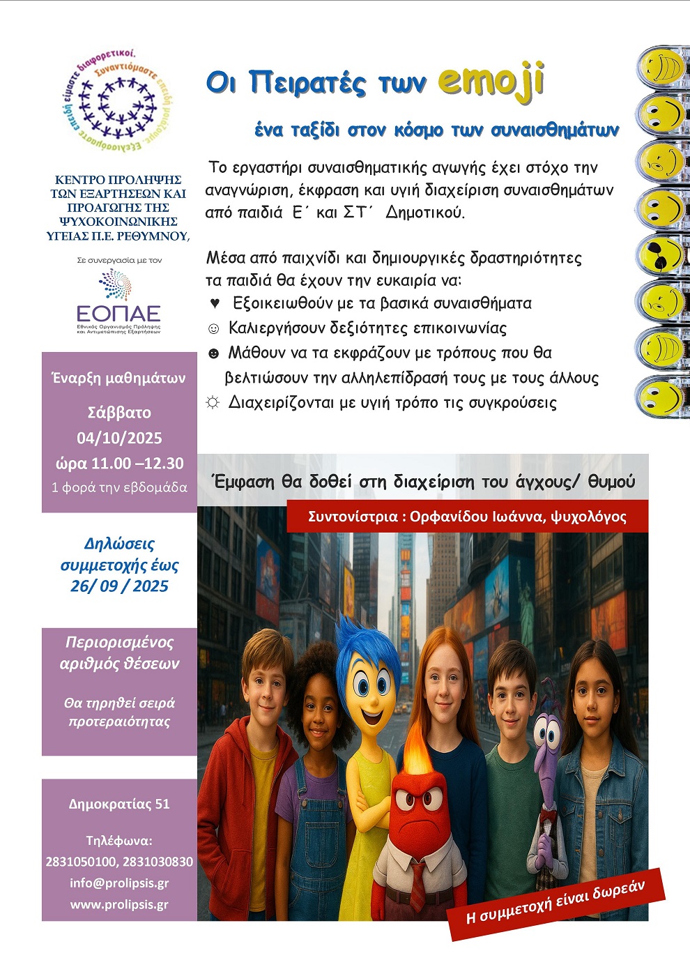 Το Κέντρο Πρόληψης των Εξαρτήσεων και Προαγωγής της Ψυχοκοινωνικής Υγείας Π.Ε. Ρεθύμνου θα πραγματοποιήσει Eργαστήρι συναισθηματικής αγωγής για παιδιά Ε‘ και ΣΤ’ Δημοτικού, με στόχο την αναγνώριση, έκφραση και υγιή διαχείριση των συναισθημάτων.