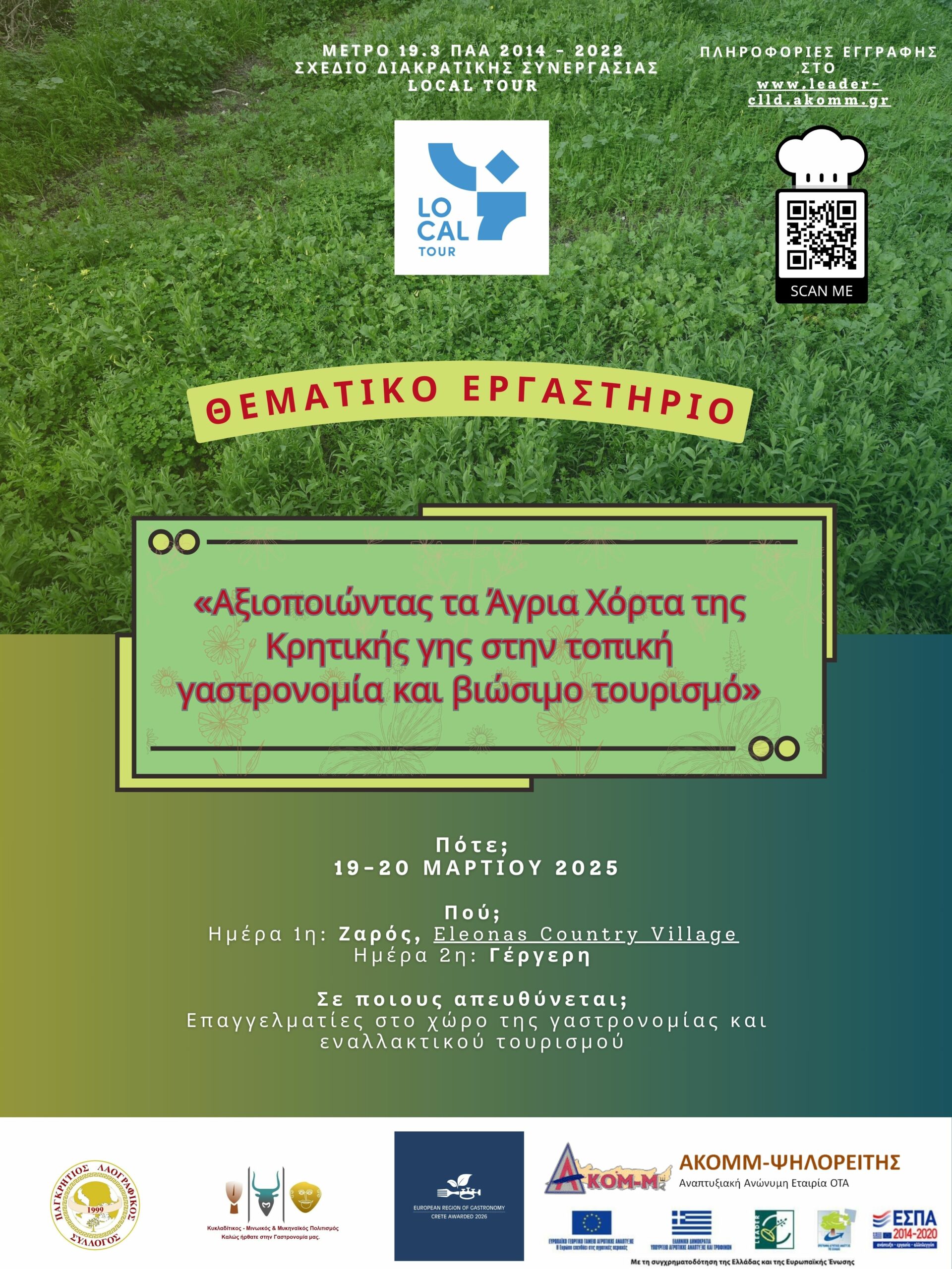 Το ΑΚΟΜΜ Ψηλορείτης ΑΕ ΟΤΑ που συμμετέχει ως εταίρος στο Διακρατικό Σχέδιο Συνεργασίας με τίτλο “Local Tour” διοργανώνει διήμερο βιωματικό Θεματικό Εργαστήριο με τίτλο: «Αξιοποιώντας τα Άγρια Χόρτα της Κρητικής γης στην τοπική γαστρονομία και βιώσιμο τουρισμό».