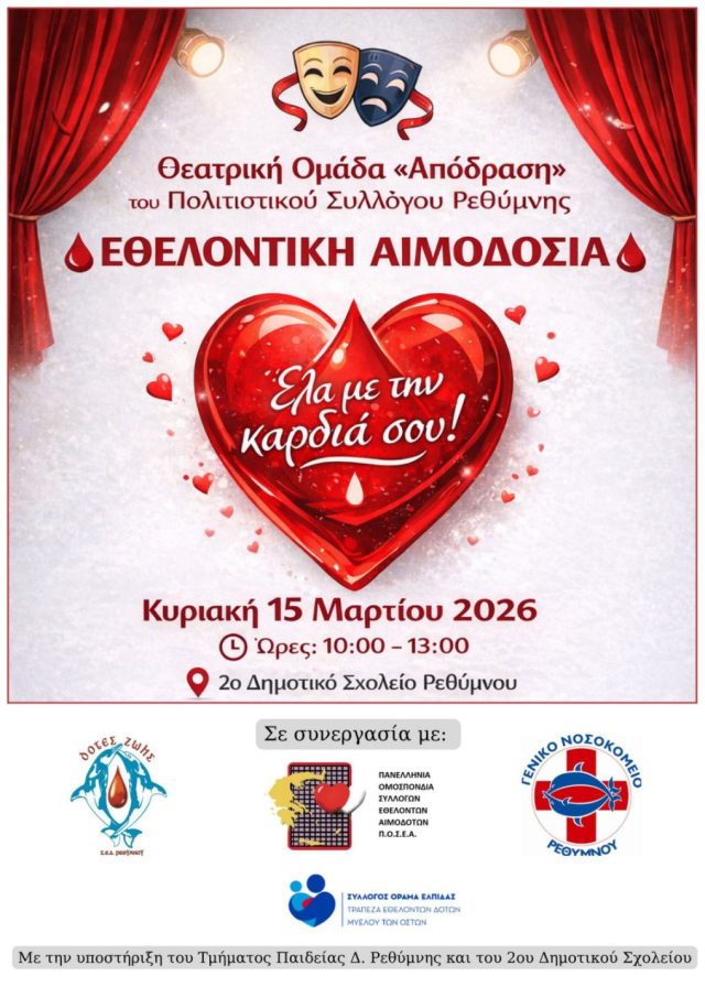 «Έλα με την καρδιά σου»: Εθελοντική αιμοδοσία διοργανώνει η Θεατρική Ομάδα «Απόδραση» του Πολιτιστικού Συλλόγου Ρεθύμνης την Κυριακή 15 Μαρτίου 2026 και ώρες 10:00 – 13:00 στον χώρο του 2ου Δημοτικού Σχολείου Ρεθύμνου.
