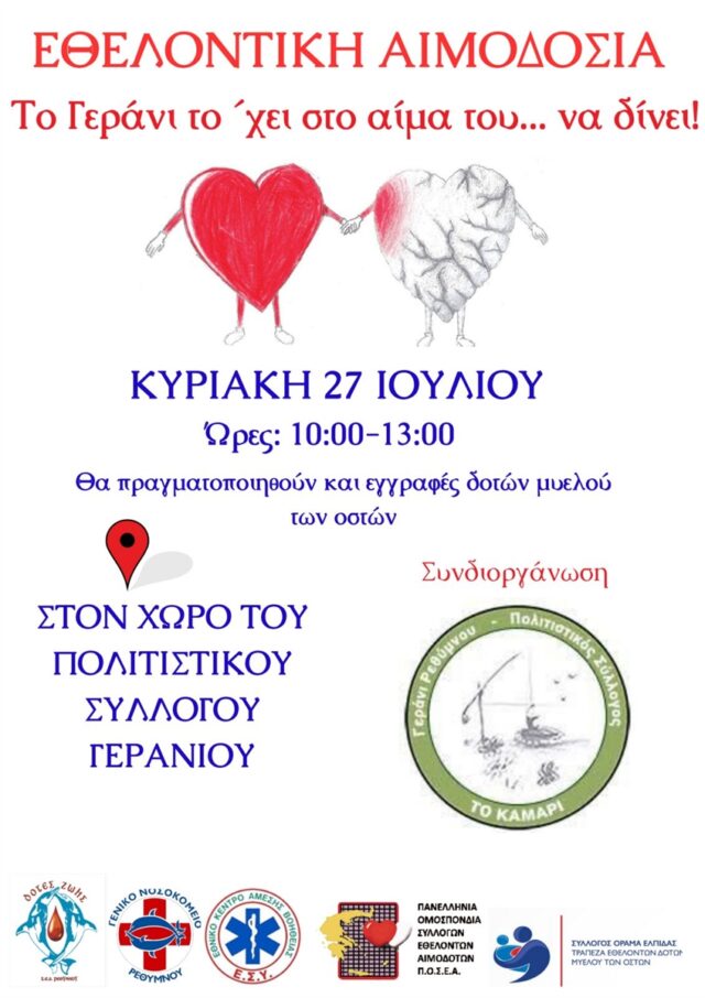 Εθελοντή αιμοδοσία θα πραγματοποιηθεί την Κυριακή 27 Ιουλίου 2025 από τις 10π.μ. έως τις 1μμ στην αίθουσα του Πολιτιστικού από τον Πολιτιστικό Σύλλογο Γερανίου ”Το Καμάρι”, μέλος του δικτύου του ΣΕΑ Ν. Ρεθύμνης «ΔΟΤΕΣ ΖΩΗΣ» με το σύνθημα: “Το Γεράνι το ΄χει στο