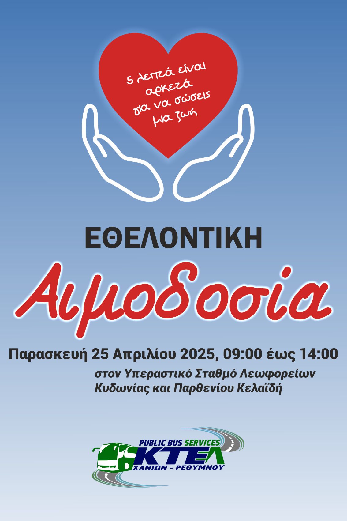 Η αιμοδοσία θα πραγματοποιηθεί σε ειδικά διαμορφωμένη αίθουσα στις εγκαταστάσεις του Υπεραστικού Σταθμού του ΚΤΕΛ στις οδούς Κυδωνίας και Παρθενίου Κελαΐδη, από τις 9 το πρωί έως τις 2 το μεσημέρι, με την υποστήριξη του προσωπικού του Τμήματος Αιμοδοσίας του Γενικού Νοσοκομείου Χανίων.