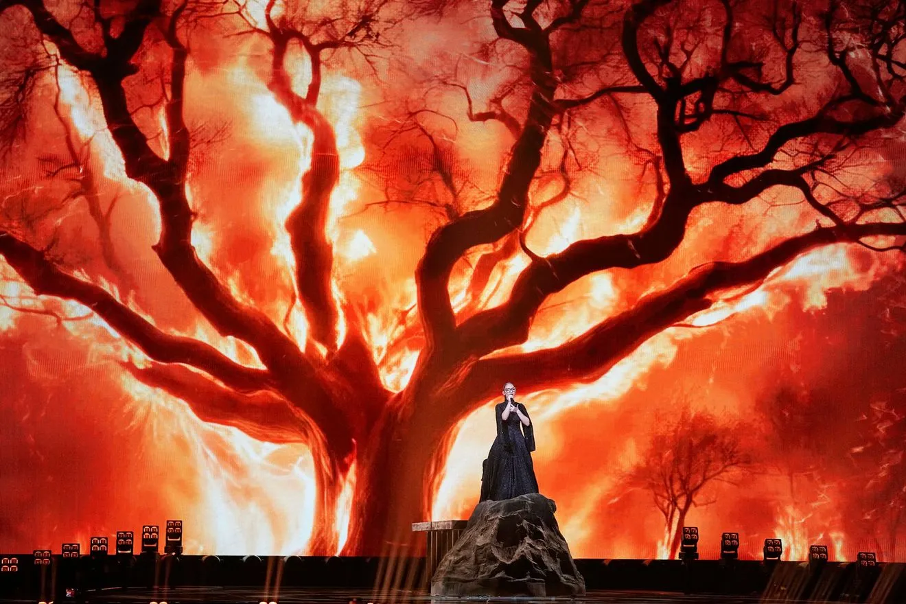 Η Κλαυδία ανέβηκε στη σκηνή του St. Jakobshalle και ερμήνευσε την Αστερομάτα με συναισθηματικό βάθος και οπτική δύναμη. Στο επίκεντρο δεσπόζει ένα εντυπωσιακό, φλεγόμενο “Δέντρο της Ζωής” – ένα εφέ που παραπέμπει στην έννοια της κληρονομιάς, των ριζών και της διαγενεακής σύνδεσης. Το δέντρο γίνεται σύμβολο μνήμης και συνέχειας, αγκαλιάζοντας τη «μικρή» ανθρώπινη ιστορία που αφηγείται η “Αστερομάτα” με φόντο έναν ψηφιακό νυχτερινό ουρανό.
