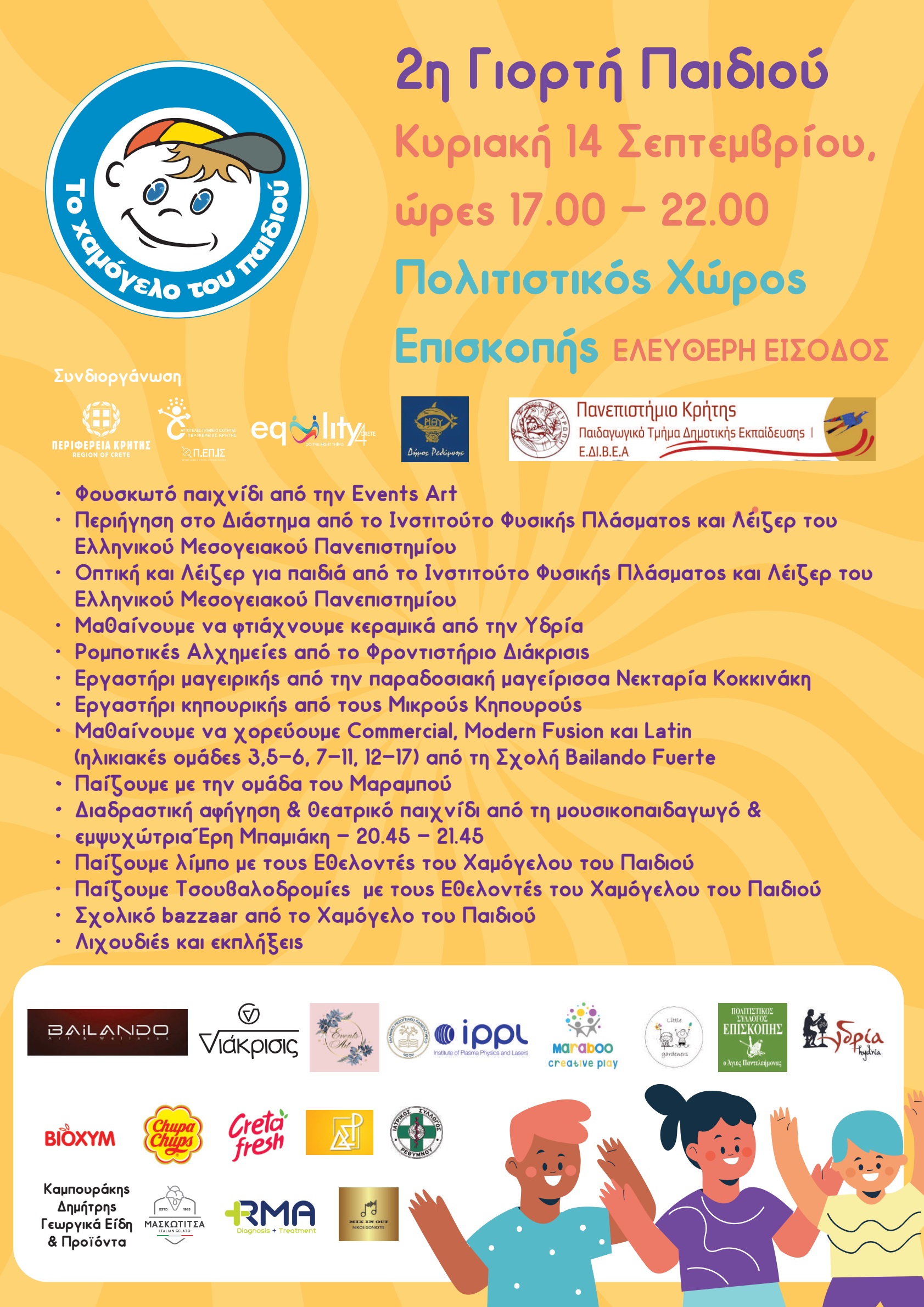 «Το Χαμόγελο του Παιδιού» σε συνεργασία με το Παιδαγωγικό Τμήμα Δ.Ε/ Ε.ΔΙ.Β.Ε.Α Πανεπιστήμιο Κρήτης, σας προσκαλούν στη 2η Γιορτή Παιδιού την Κυριακή 14 Σεπτεμβρίου στο Χώρο του Πολιτιστικού Συλλόγου Επισκοπής και ώρες 17.00 έως 22.00 και από την Παρασκευή 19 Σεπτεμβρίου έως και την Κυριακή 21 Σεπτεμβρίου στον Δημοτικό Κήπο Ρεθύμνου και ώρες από 17.00 έως 23.00.