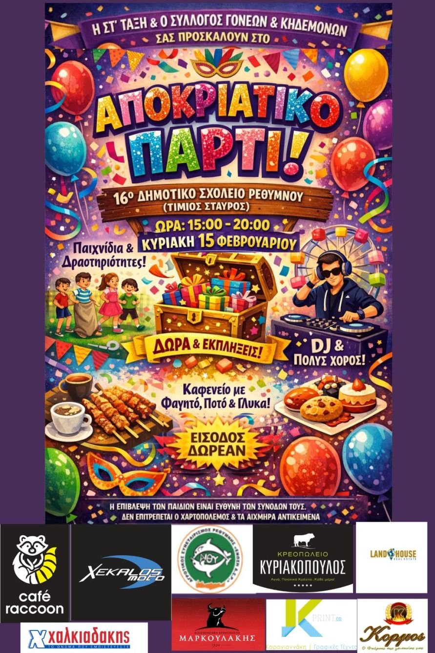Η ΣΤ’ τάξη και ο Σύλλογος Γονέων & Κηδεμόνων του 16ου Δημοτικού Σχολείου Ρεθύμνου (Τίμιος Σταυρός) διοργανώνουν Αποκριάτικο Πάρτι την Κυριακή 15 Φεβρουαρίου, από τις 15:00 έως τις 20:00, στον χώρο του σχολείου.