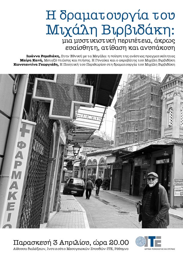 Ο Τομέας Θεατρολογίας του Ινστιτούτου Μεσογειακών Σπουδών διοργανώνει εκδήλωση με θέμα το θεατρικό έργο του ηθοποιού, συγγραφέα και σκηνοθέτη Μιχάλη Βιρβιδάκη. Η εκδήλωση έχει τίτλο «Η δραματουργία του Μιχάλη Βιρβιδάκη: μια μυστικιστική περιπέτεια, άκρως ευαίσθητη, ατίθαση και ανυπάκουη» και θα πραγματοποιηθεί την Παρασκευή 3 Απριλίου, στην αίθουσα διαλέξεων του ΙΜΣ, στις 8 μμ.