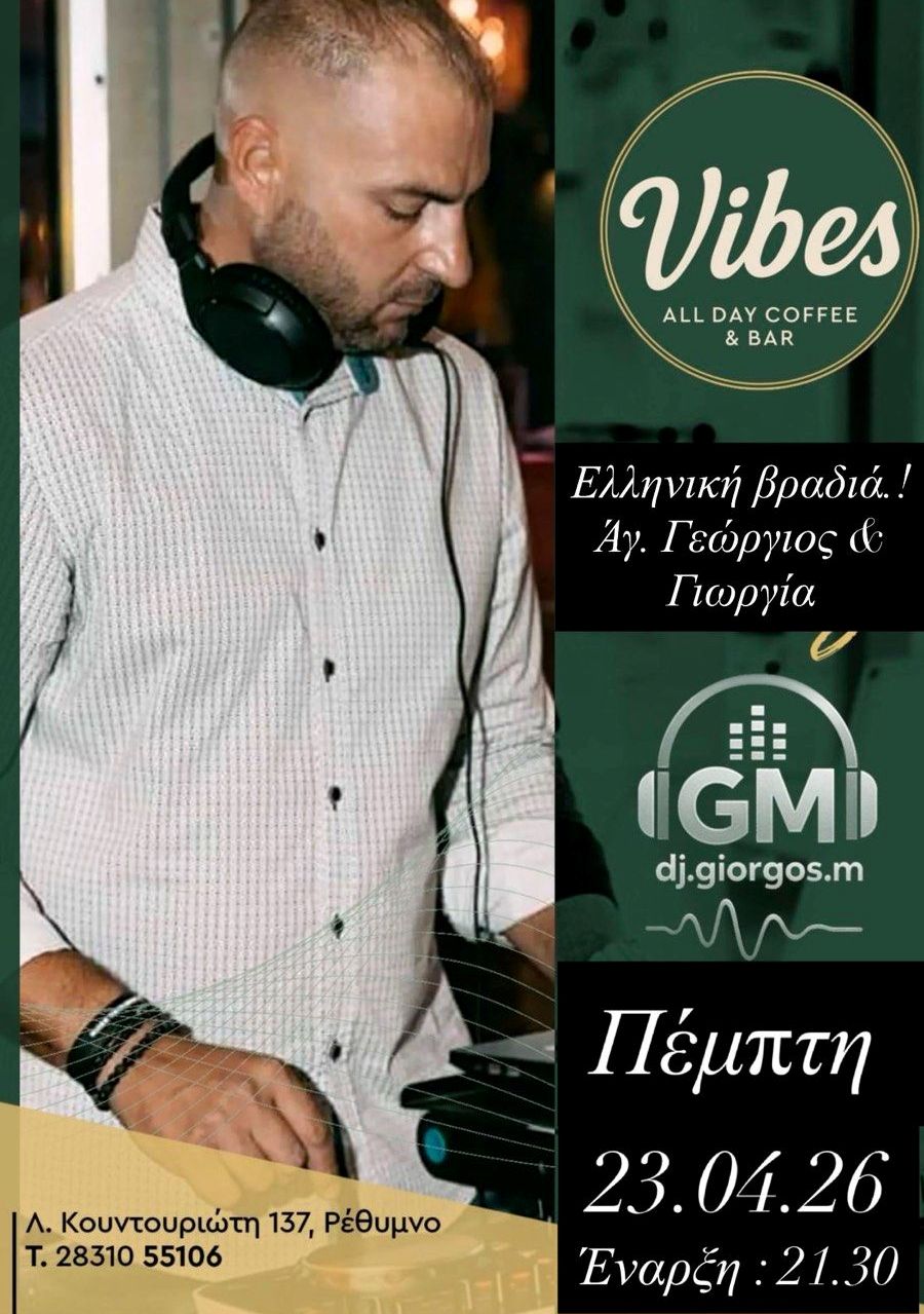 Την Πέμπτη 23 Απριλίου, μετά τις 21:30, το Vibes φιλοξενεί ένα party με ελληνικές επιτυχίες, όπου η διασκέδαση ανεβαίνει στα ύψη!