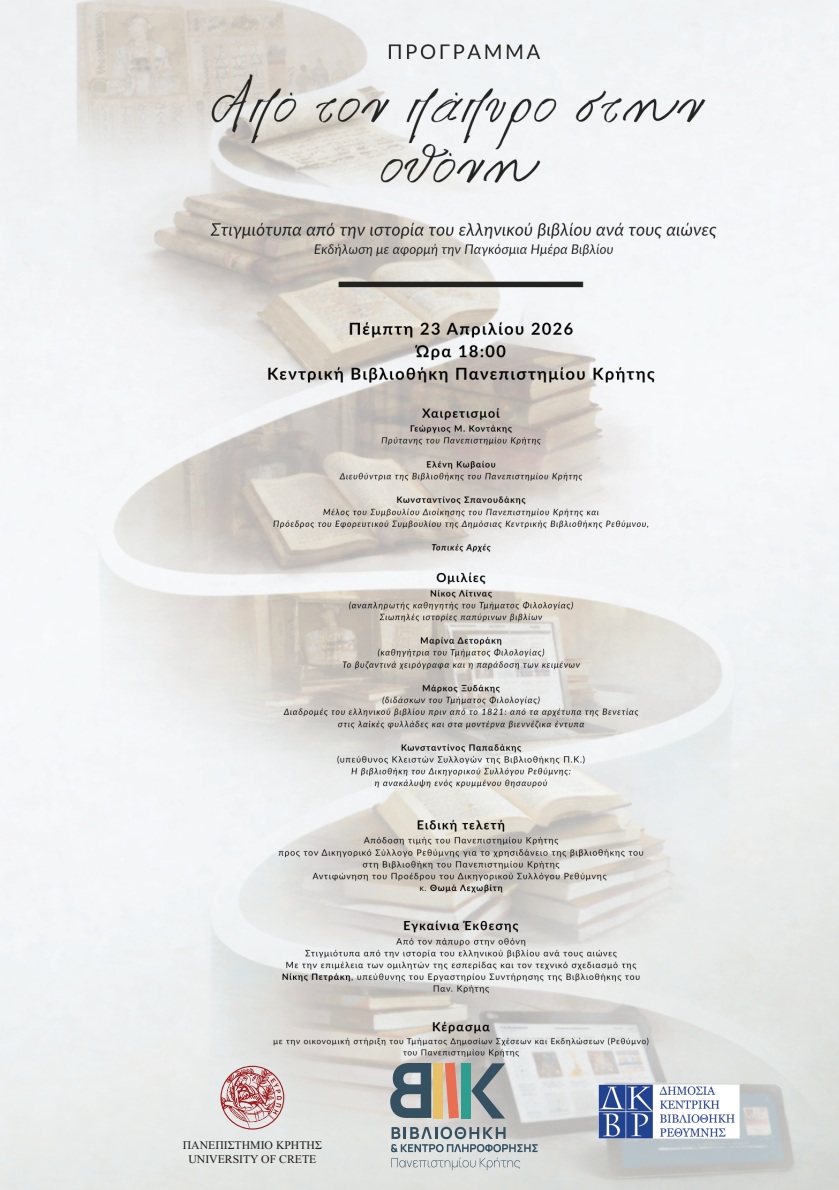Το Πανεπιστήμιο Κρήτης, η Κεντρική Βιβλιοθήκη του Ιδρύματος και η Δημόσια Κεντρική Βιβλιοθήκη Ρεθύμνου, συν-εορτάζοντας την Παγκόσμια Ημέρα Βιβλίου, διοργανώνουν εσπερίδα με θέμα: «Από τον πάπυρο στην οθόνη: στιγμιότυπα από την ιστορία του ελληνικού βιβλίου ανά τους αιώνες».