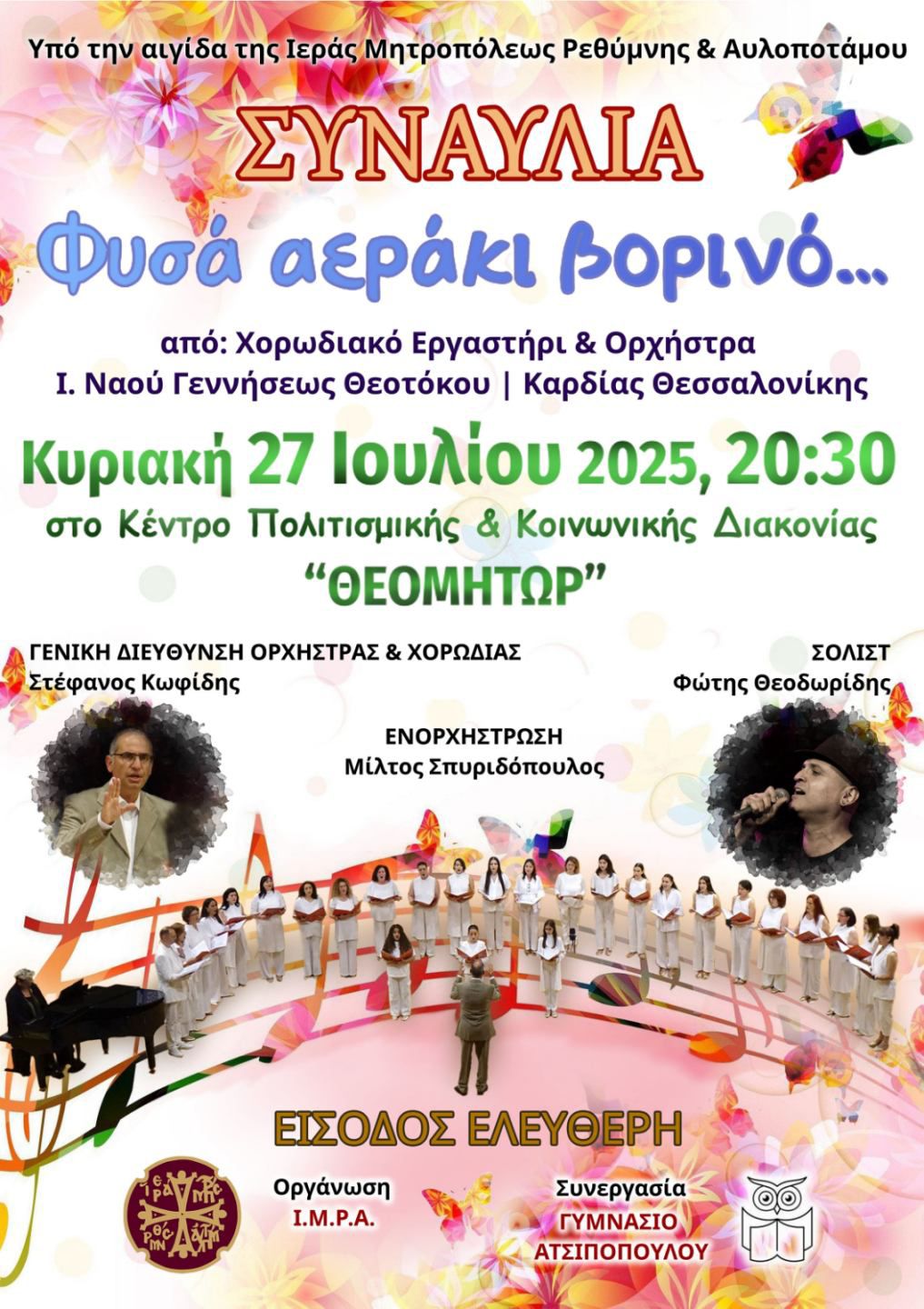 Υπό την αιγίδα της Ιεράς Μητροπόλεως Ρεθύμνης και Αυλοποτάμου, διοργανώνεται την Κυριακή 27 Ιουλίου 2025 και ώρα 20:30 μια ξεχωριστή συναυλία με τίτλο «Φυσά αεράκι βορινό…», στο Κέντρο Πολιτισμικής & Κοινωνικής Διακονίας “ΘΕΟΜΗΤΩΡ”.
