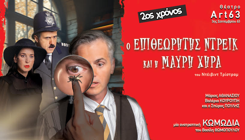 Η κωμική παράσταση “ο Επιθεωρητής Ντρέικ και η Μαύρη χήρα ” του βρετανού συγγραφέα David Tristram παρουσιάζεται για πρώτη φορά στο Ελληνικό κοινό, σε σκηνοθεσία του Βασίλη Θωμόπουλου. Ένας φόνος ,δεκαέξι ύποπτοι!