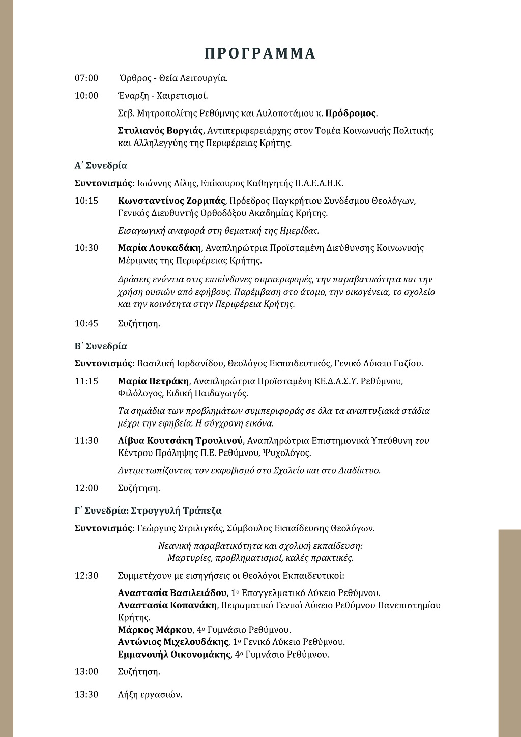 Ημερίδα διοργανώνει ο Παγκρήτιος Σύνδεσμος Θεολόγων σε συνδιοργάνωση με τη Σχολή Γονέων της Ιεράς Μητροπόλεως Ρεθύμνης και Αυλοποτάμου με θέμα «Η προβληματική της βίας και του εκφοβισμού: Νεανική παραβατικότητα και σύγχρονο σχολείο».