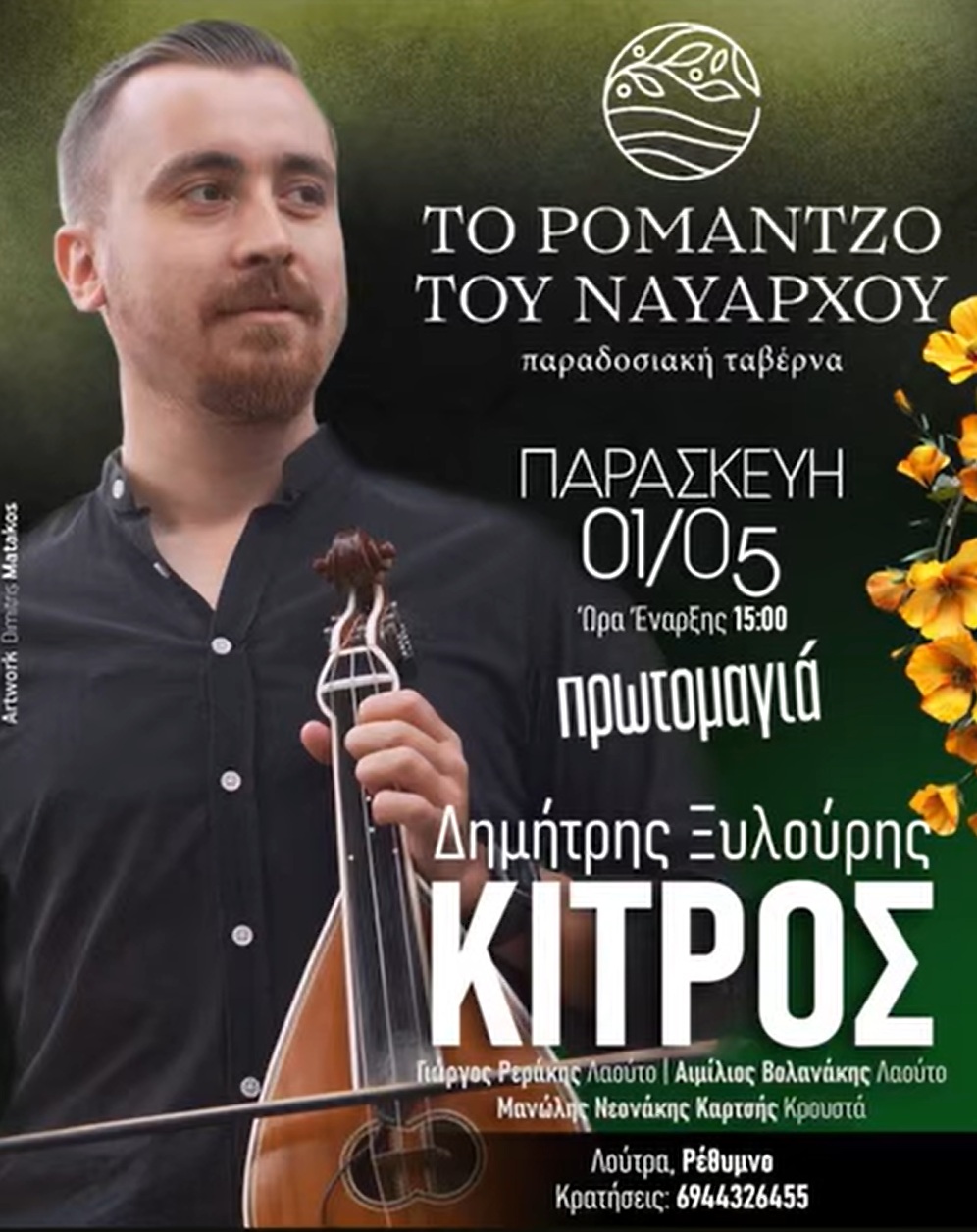 Κρητική μουσική με το Δημήτρη Ξυλούρη (Κίτρος) στην Ταβέρνα «Το Ρομάντζο του Ναυάρχου» (Λούτρα Ρεθύμνου).