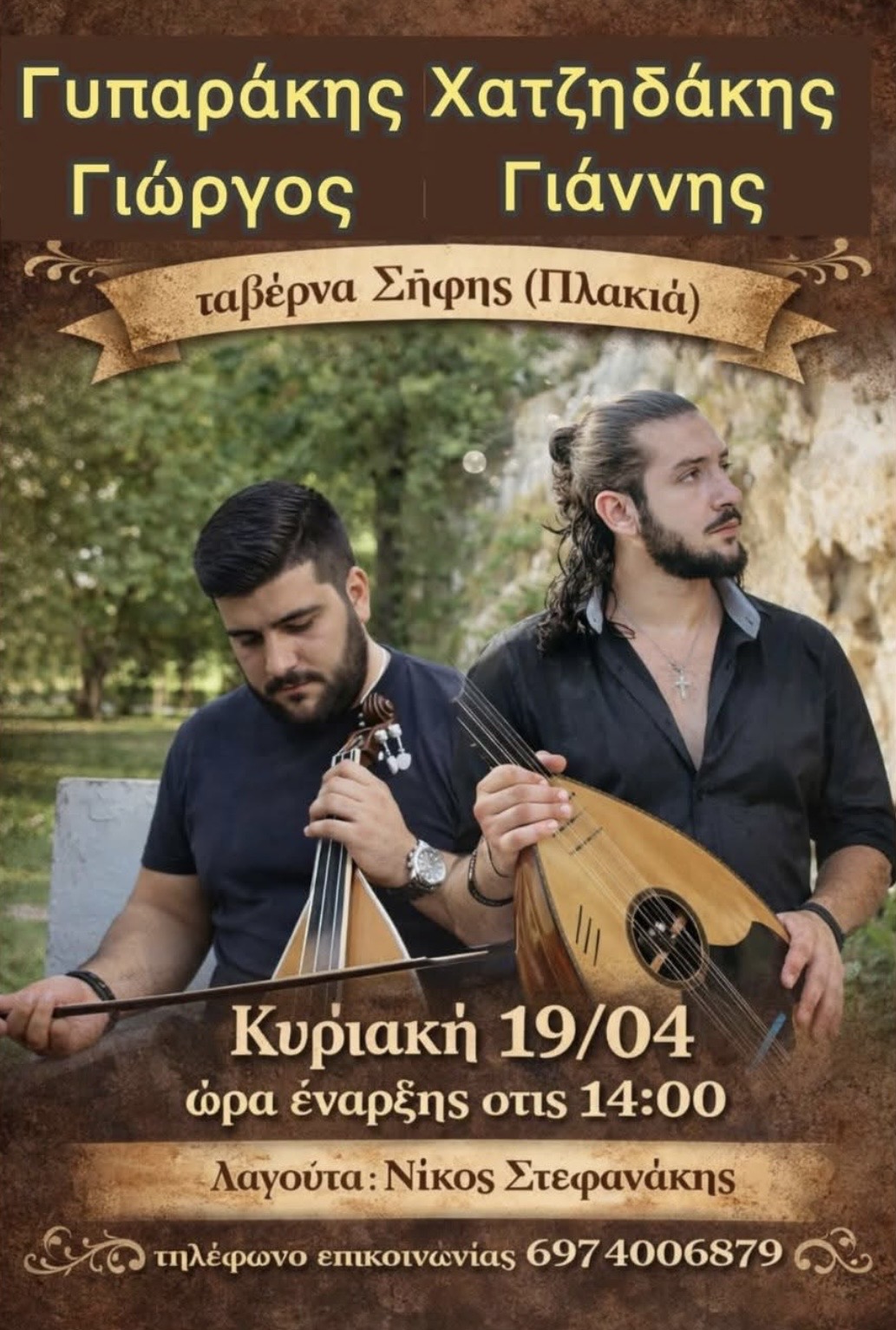 Κρητική μουσική στην Ταβέρνα Σήφης στον Πλακιά με τους Γιώργο Γυπαράκη (λύρα) και Γιάννη Χατζηδάκη (λαούτο).