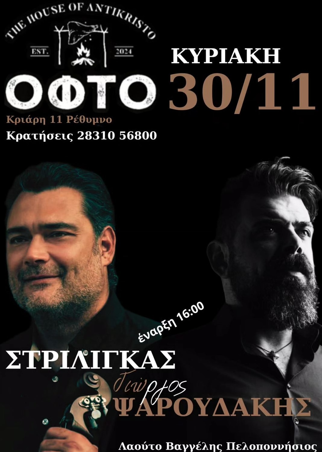 Κρητική μουσική στο «Οφτό» με τους Γιώργο Στριλιγκά και Γιώργο Ψαρουδάκη. Μαζί τους ο Γιώργος Πελοποννήσιος.