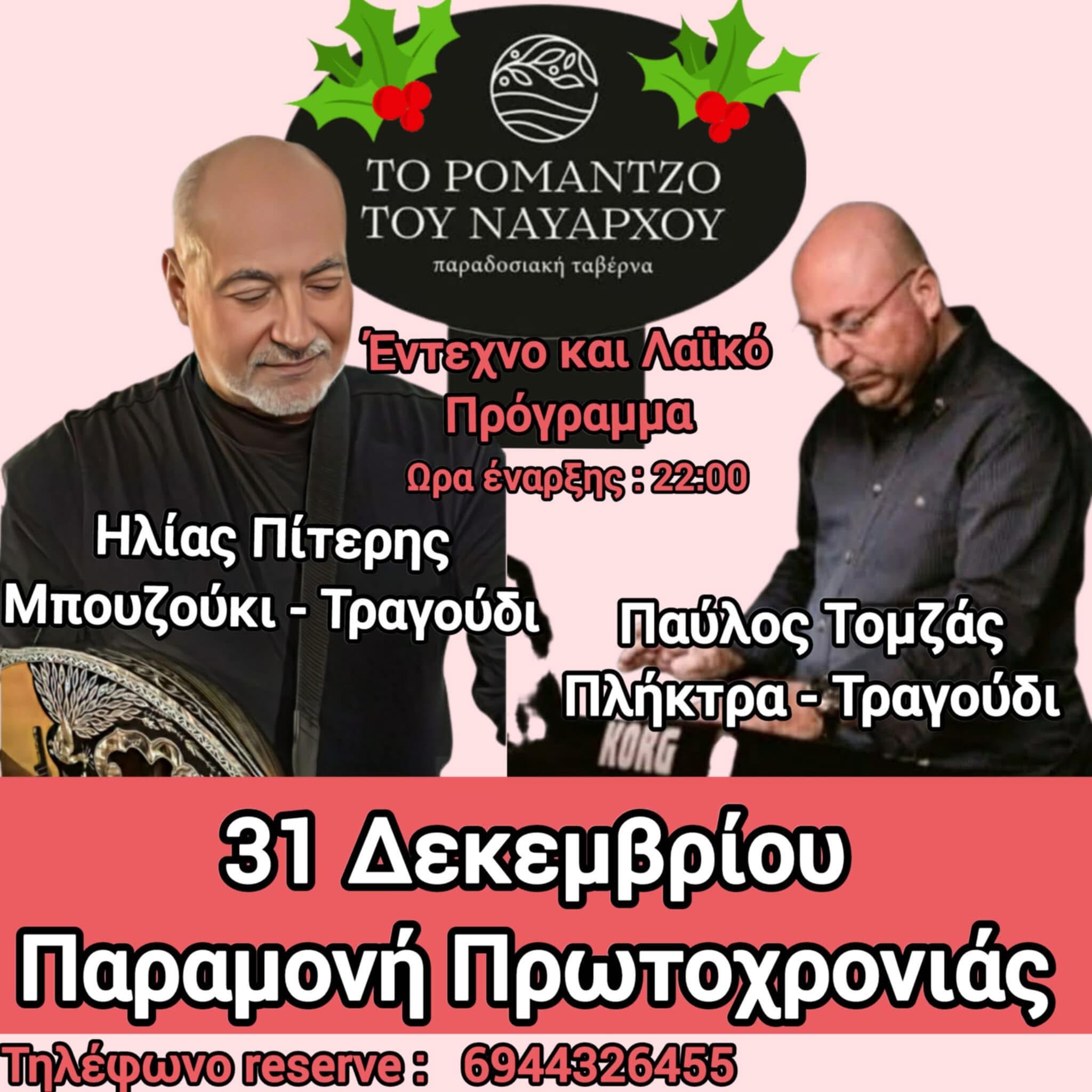 Μουσική βραδιά με τον Ηλία Πίτερη (μπουζούκι – τραγούδι) και τον Παύλο Τομζά (πλήκτρα – τραγούδι) στην Ταβέρνα «Το Ρομάντζο του Ναυάρχου» (Λούτρα Ρεθύμνου).