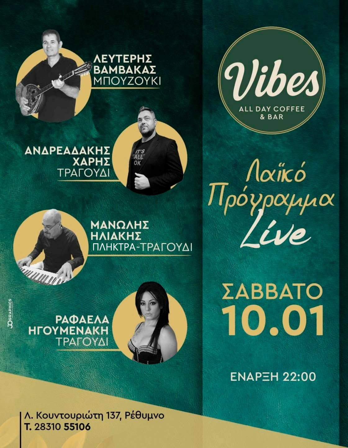 Μουσική βραδιά με τους Λευτέρη Βαμβακά, Χάρη Ανδρεαδάκη, Μανώλη Ηλιάκη και Ραφαέλα Ηγουμενάκη στο Vibes All Day Coffee & Bar (Κουντουριώτου 137, Ρέθυμνο).