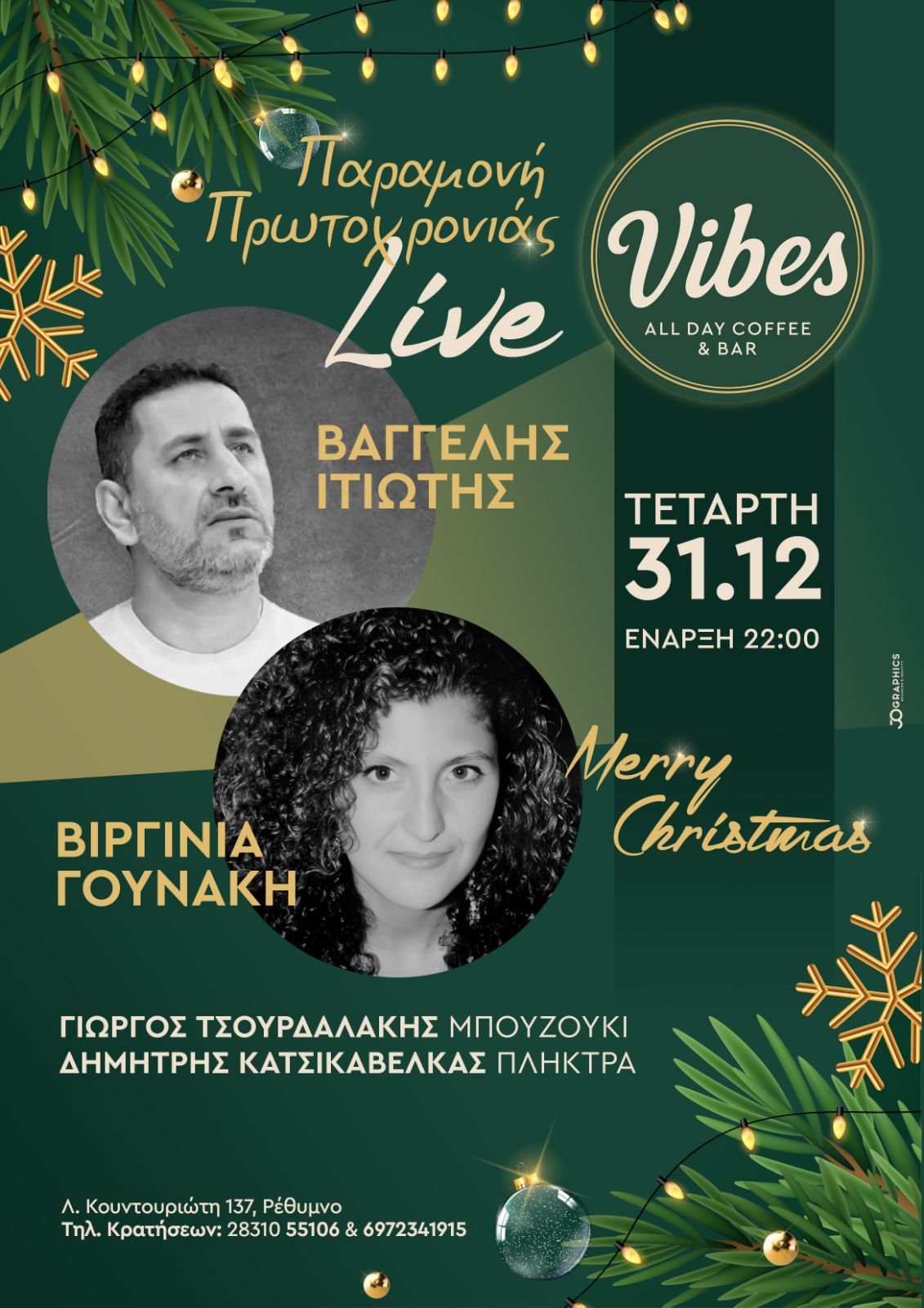 Παραμονή Πρωτοχρονιάς με τους Βαγγέλη Ιτιώτη και Βιργινία Γουνάκη στο Vibes All Day Coffee & Bar (Κουντουριώτου 137, Ρέθυμνο).