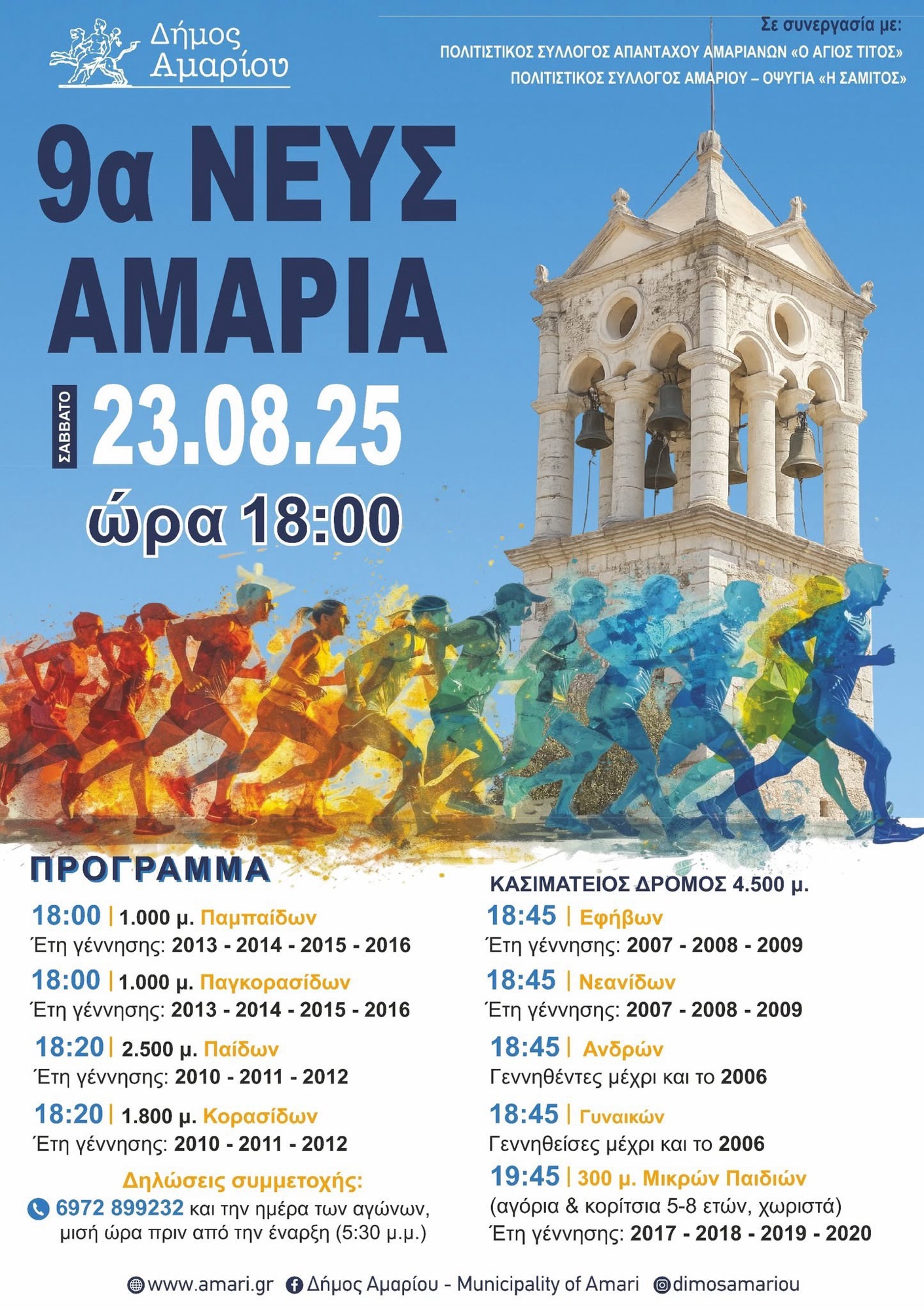 18:00 Ο ΔΗΜΟΣ ΑΜΑΡΙΟΥ σε συνεργασία με τον Πολιτιστικό Σύλλογο απανταχού Αμαριανών ο “ΑΓΙΟΣ ΤΙΤΟΣ” και τον Πολιτιστικό Σύλλογο Αμαρίου – Οψιγιά “Η ΣΑΜΙΤΟΣ” διοργανώνουν τους αγώνες Λαϊκούς αγώνες δρόμου «ΝΕΥΣΑΜΑΡΙΑ», στις 23 Αυγούστου 2025, ημέρα Σάββατο και ώρα 6:00 μ.μ. στο Νευς Αμάρι, στο πλαίσιο των εκδηλώσεων της γιορτής του Αγίου Τίτου, με ελεύθερη συμμετοχή στις παρακάτω κατηγορίες: