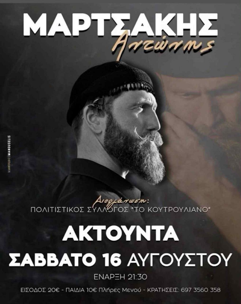 Μουσική βραδιά με τον Αντώνη Μαρτσάκη, διοργανώνει ο Πολιτιστικός Σύλλογος «Το Κουτρουλιανό» στα Ακτούντα του Δήμου Αγίου Βασιλείου, το Σάββατο 16 Αυγούστου.