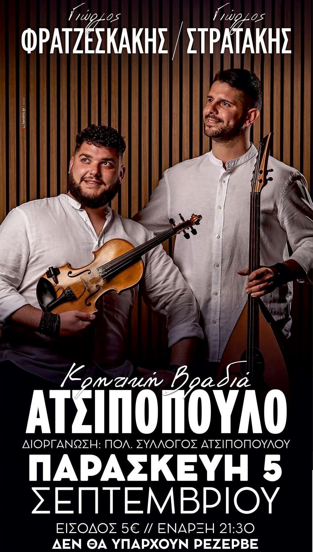 Ο Γιώργος Φραντζεσκάκης και ο Γιώργος Στρατάκης ζωντανά στο Ατσιπόπουλο Ρεθύμνου, την Παρασκευή 5 Σεπτεμβρίου.