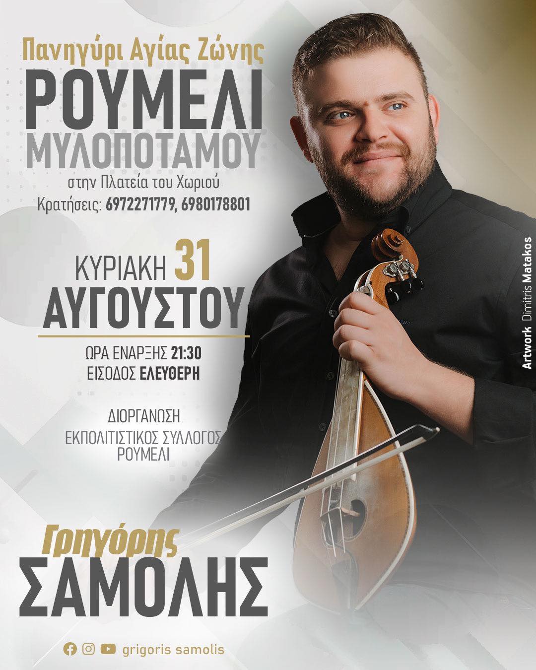 Ο Γρηγόρης Σαμόλης ζωντανά στο Ρουμελί Μυλοποτάμου την Κυριακή 31 Αυγούστου 2025.