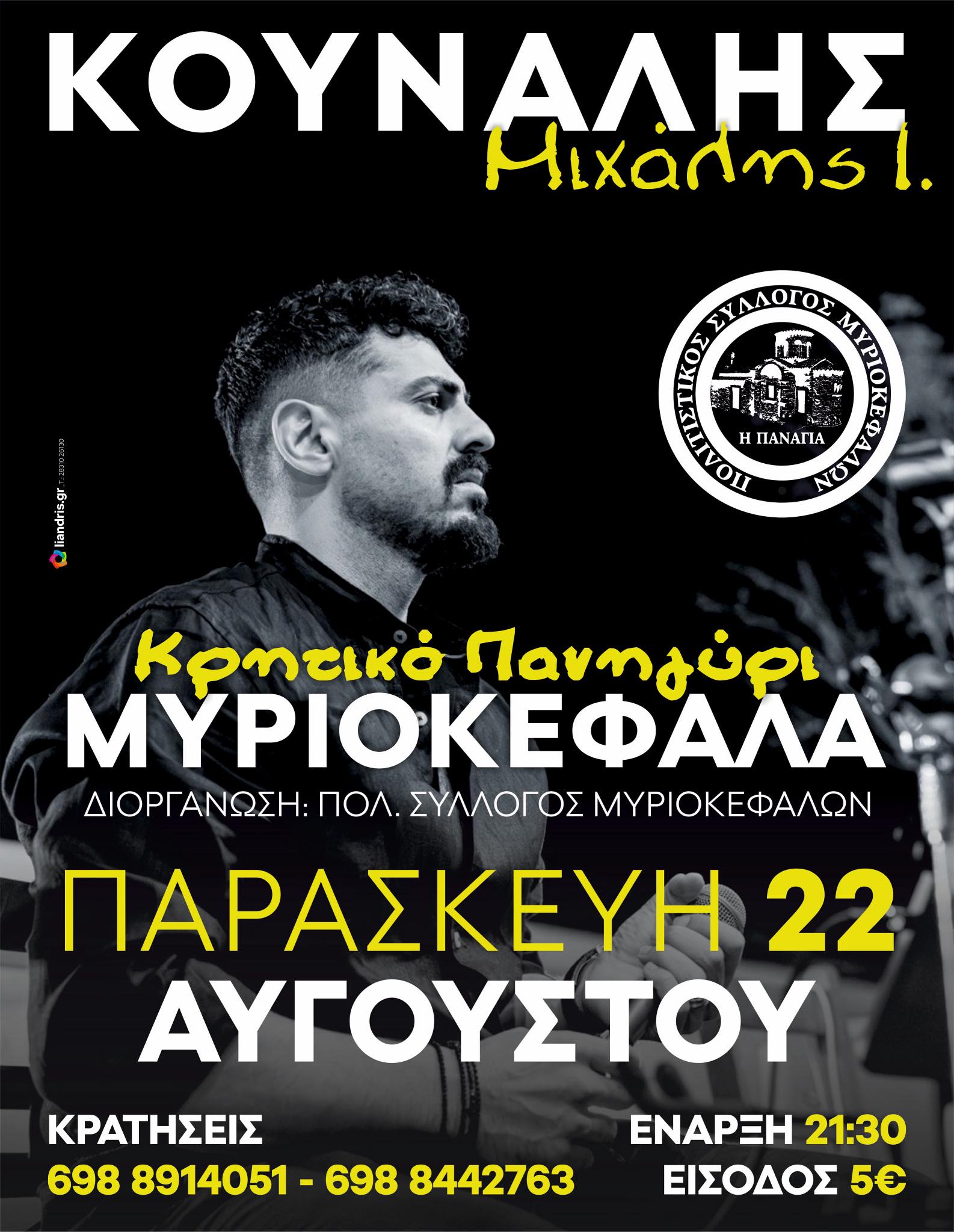 Κρητικό πανηγύρι στα Μυριοκέφαλα Ρεθύμνου την Παρασκευή 22 Αυγούστου. Θα σας διασκεδάσει το συγκρότημα του Μιχάλη Ι. Κουνάλη.