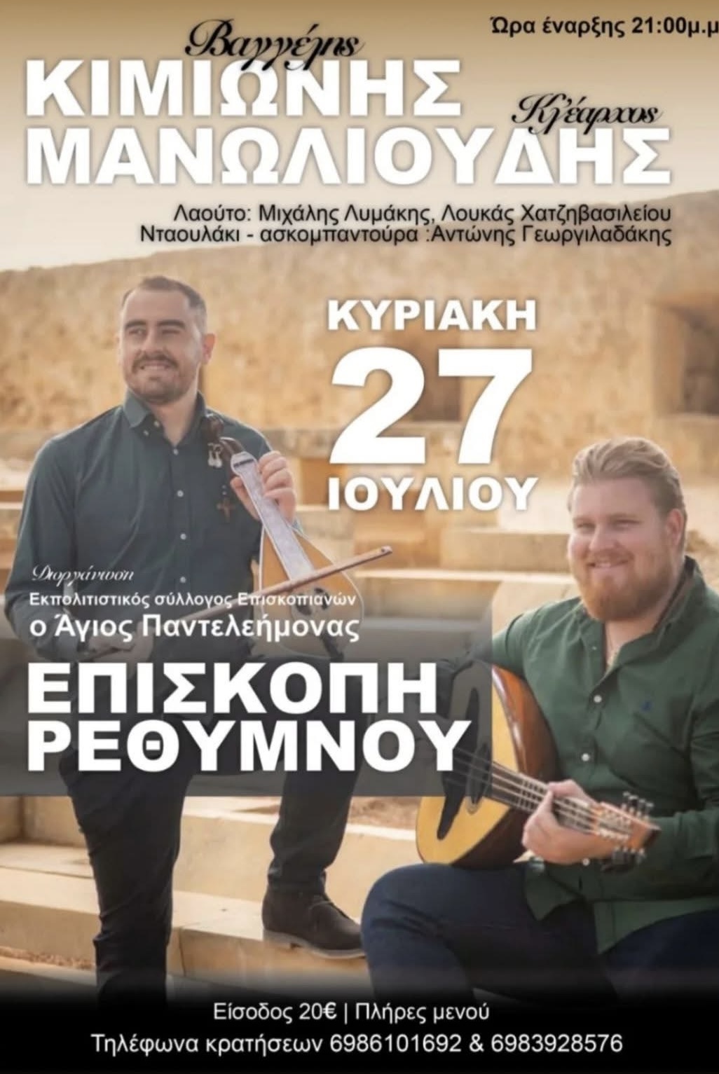 Πανηγύρι με τους Βαγγέλη Κιμιωνή και Κλέαρχο Μανωλιούδη, διοργανώνει στην Επισκοπή Ρεθύμνου ο Πολιτιστικός Σύλλογος Επισκοπής.