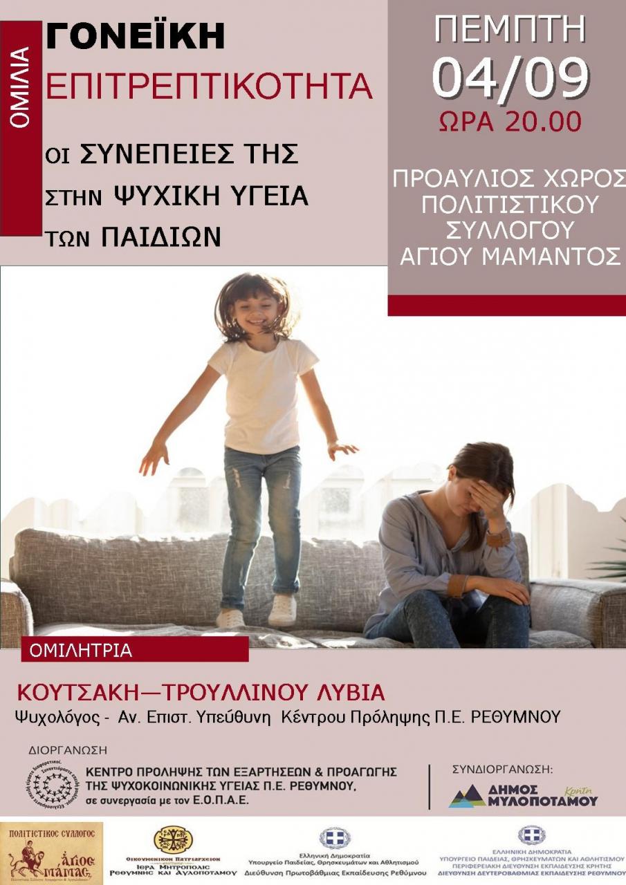 Το Κέντρο Πρόληψης των Εξαρτήσεων και Προαγωγής της Ψυχοκοινωνικής Υγείας Π.Ε Ρεθύμνης, στα πλαίσια της συνεργασίας του με τους Δήμους της Π.Ε. Ρεθύμνου, την Ιερά Μητρόπολη Ρεθύμνης και Αυλοποτάμου και την Ιερά Μητρόπολη Λάμπης και Σφακίων, τις Διευθύνσεις Πρωτοβάθμιας και Δευτεροβάθμιας Διεύθυνσης Ρεθύμνου και τους κατά τόπους φορείς και Πολιτιστικούς Συλλόγους συνεχίζει τη σειρά ομιλιών για γονείς με θέμα: «Γονεϊκή Επιτρεπτικότητα: οι συνέπειες στην ψυχική ζωή των παιδιών», σε όλη την Περιφερειακή ενότητα Ρεθύμνου.